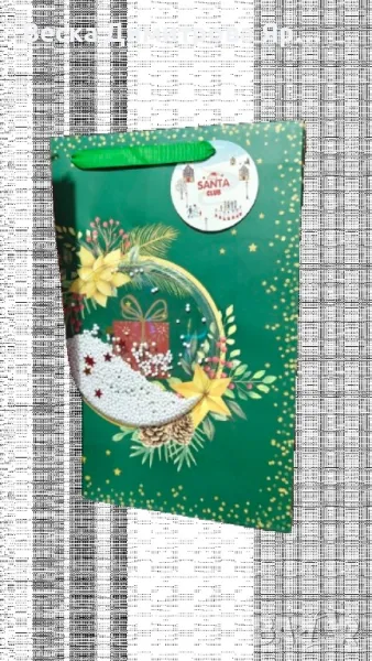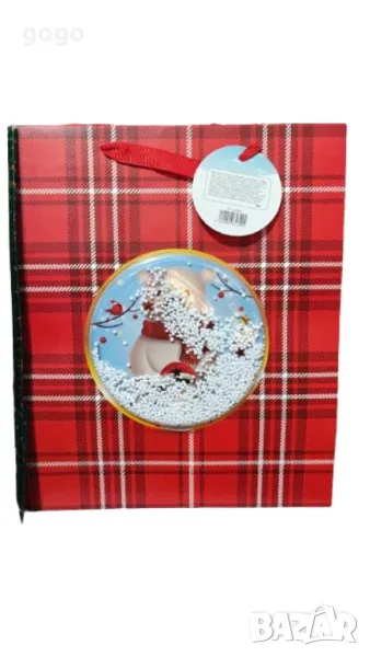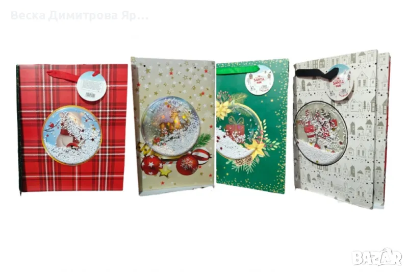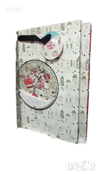 Размери: Стандартен размер;Материал: Здрав картон, устойчив на разкъсване;Декорация: Снежна топка с изкуствени снежинки, разположена в центъра на чантата;Дръжки: Здрави текстилни дръжки за лесно носене;Цветови варианти: Червено, златисто, зелено и бяло - с различни празнични мотиви.