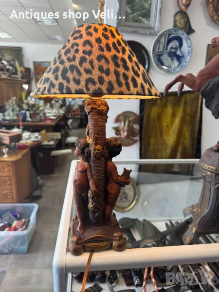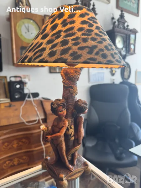 Винтидж настолна лампа с интересен дизайн. Добро състояние. Предлагаме доставка с Еконт и лично предаване за градовете Велико Търново, Русе и Сливен.