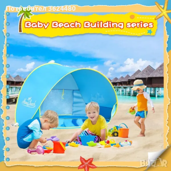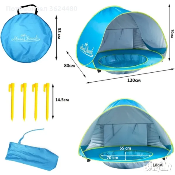 Мултифункционалност: Подходяща за плаж, градина, къмпинг и други открити пространства, тази палатка е перфектният избор за семейни излети. Тя осигурява сянка и защита, както и място за игра и разхлаждане на малките.