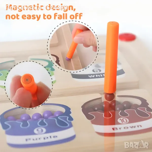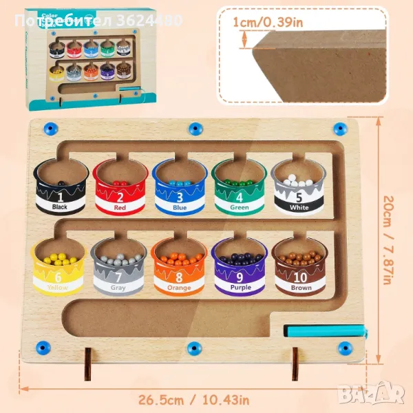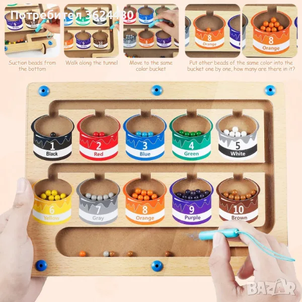 Играчката е създадена да насърчава разпознаването на цветове и числа, като същевременно помага на децата да развиват умения за броене. Магнитният лабиринт задържа вниманието на децата, като ги кара да се съсредоточат и да се забавляват. Изработен от здраво дърво и оцветен с безопасни, водоразтворими бои, този продукт е напълно безопасен за игра.
