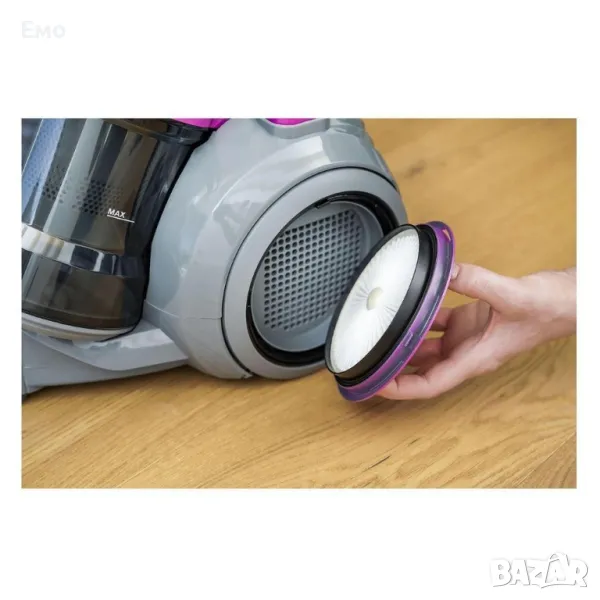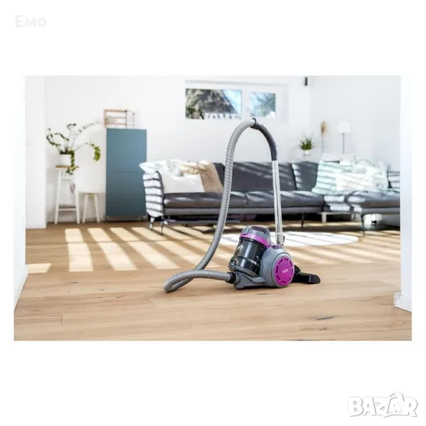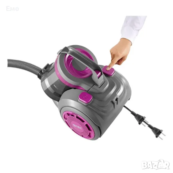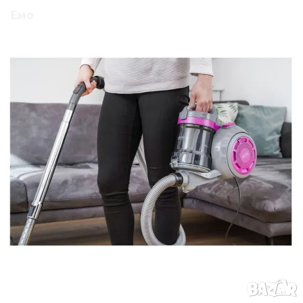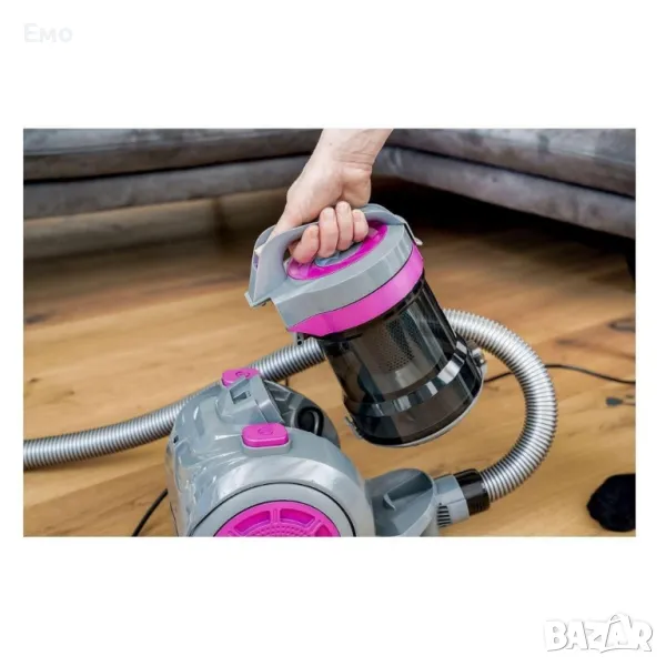 Мощност: 800W; Система с циклонен филтър: Да; Вместимост на контейнера за прах: 2 литра; Метална телескопична тръба: До 116 см; Четка за твърди подови настилки и килими: Да; Дължина на всмукателния маркуч: 150 см; Механизъм за автоматично навиване на кабела: 480 см; Ниво на смукателна мощност: 1; Филтри (HEPA): На входящ и изходящ въздух; Принадлежности: 2 в 1 накрайник за тесни пространства; Ниво на шума: < 80 dB(A); Мрежово напрежение: 220-240V • 50-60 Hz; Цвят: Син, розов; Размери: 30 x 30 x 102 см; Тегло: 4,4 кг.