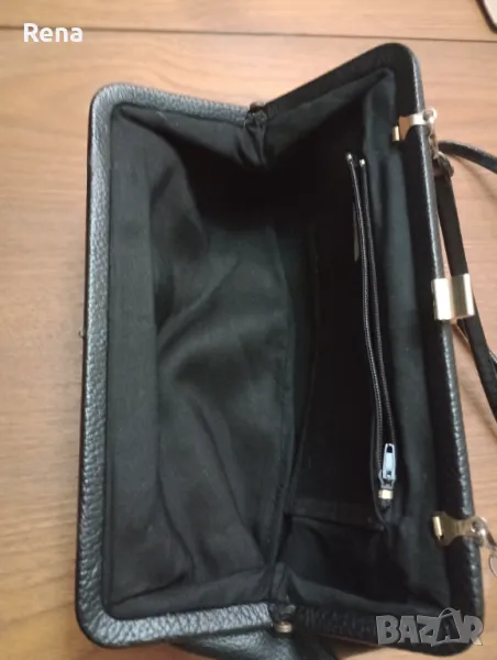 Ретро дамска черна чанта тип портмоне, но може да се носи и през рамо с възможност дръжката да се откача или прибира в чантата. Вътре е с една преграда и.едно джобче за портмонето. Портмонето също е ретро. Има етикет на производителя. Размери на чантата:
