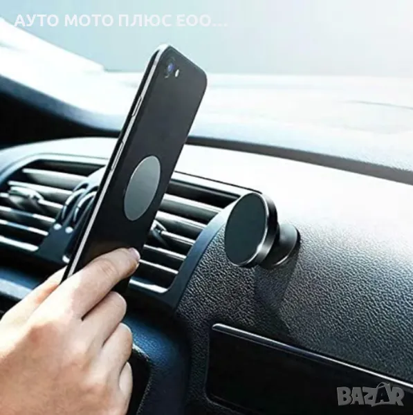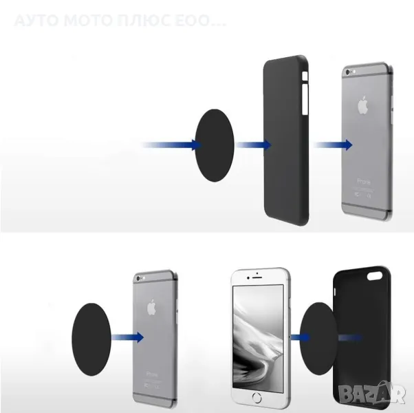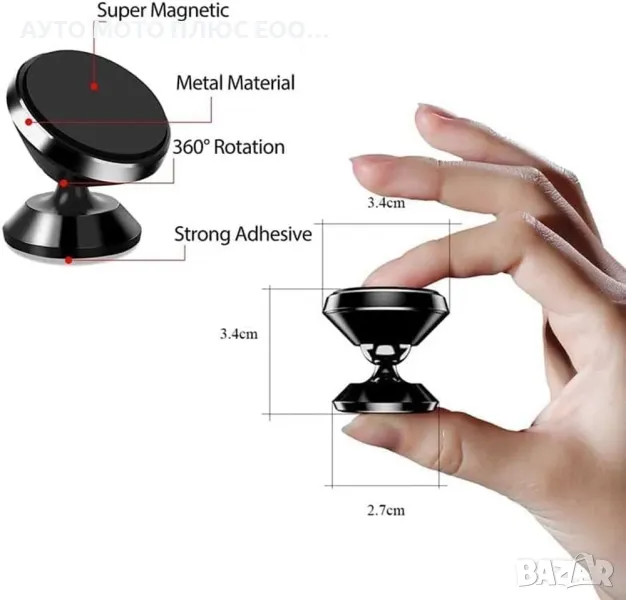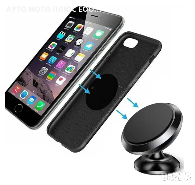 Лепяща се за таблото на колата поставка за телефон. Магнитният държач може да се върти на 360 градуса, което позволява да поставите телефона си под всякакъв ъгъл. В комплекта има метален диск, който се поставя върху капака на мобилния телефон. Силен магнит държи здраво телефона върху поставката. Поставката може да се използва и на работното място или в домашни условия. Може да се монтира на почти всяка повърхност - метал, пластмаса, стъкло.