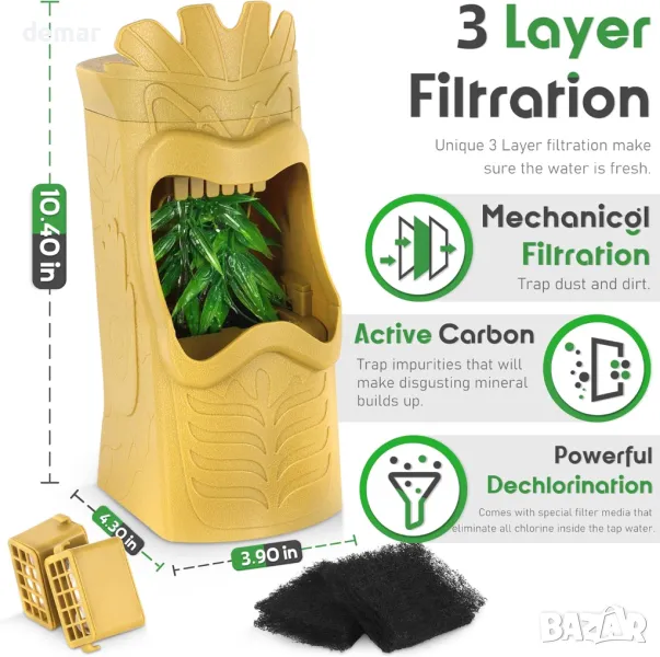Филтриращата система Tap Water Works включва уникална трислойна филтрация, която ефективно премахва примесите от чешмяната вода, елиминирайки нуждата от скъпа бутилирана вода. Сензор за ниво на синя светлина показва кога е време за презареждане, като гарантира, че никога няма да гадаете нивото на водата. Специфичната филтърна кутия използва специално предназначена среда за предотвратяване на неприятни минерални отлагания от твърда вода и вредни вещества, които биха могли да повлияят на храносмилателното здраве на вашия домашен любимец. Поддръжката е безпроблемна, тъй като почистването или смяната на филтърната кутия отнема само пет секунди. В допълнение, регулируемата безшумна помпа предлага персонализирани нива на потока (1 до 3), без да нарушава вашата домашна среда или чувствителни домашни любимци.