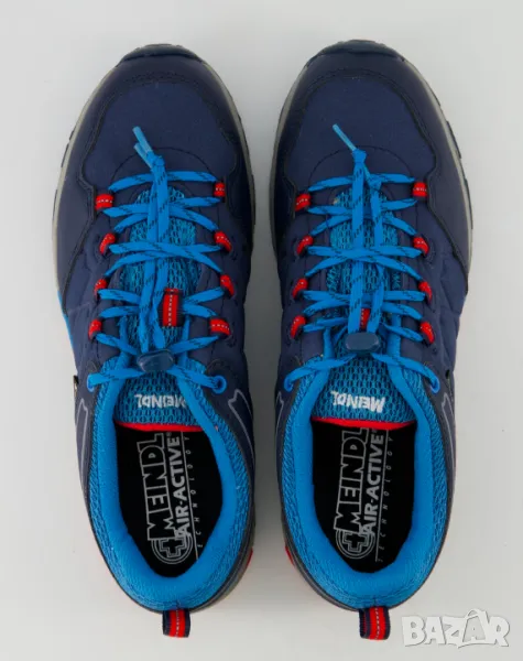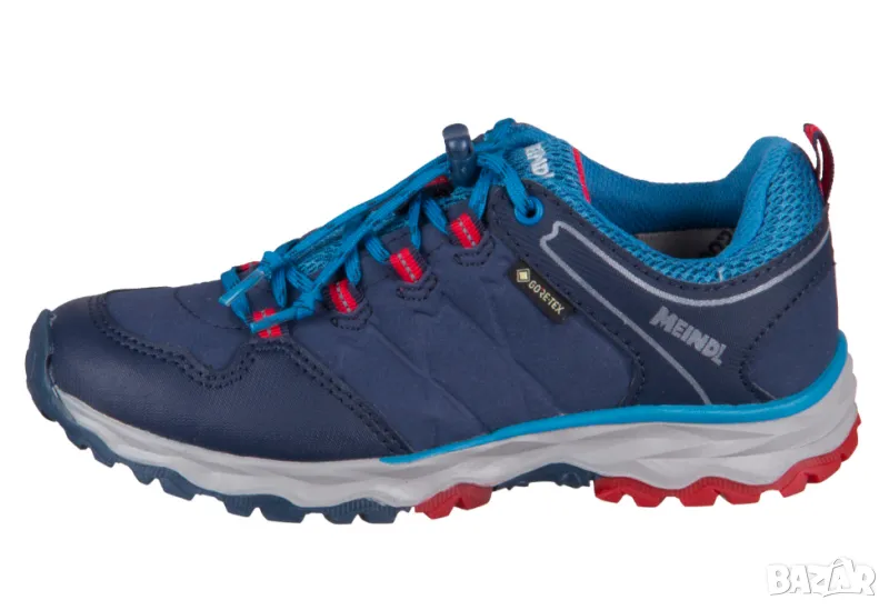 Cool trekking ниски обувки в страхотно синьо/тъмно синьо и червено, изработени от горен материал велур/мрежа и пластмаса за защита над областта на пръстите на краката. Вътрешната подплата и подвижната стелка са изработени от дишащ текстил. Здравата външна подметка с протектор е изработена от гума. Благодарение на вградената оригинална мембрана GoreTex, тази обувка е 100% водоустойчива, ветроустойчива и дишаща. Връзката с практичен цип позволява обувката лесно да се регулира по крака и улеснява обуването и събуването.