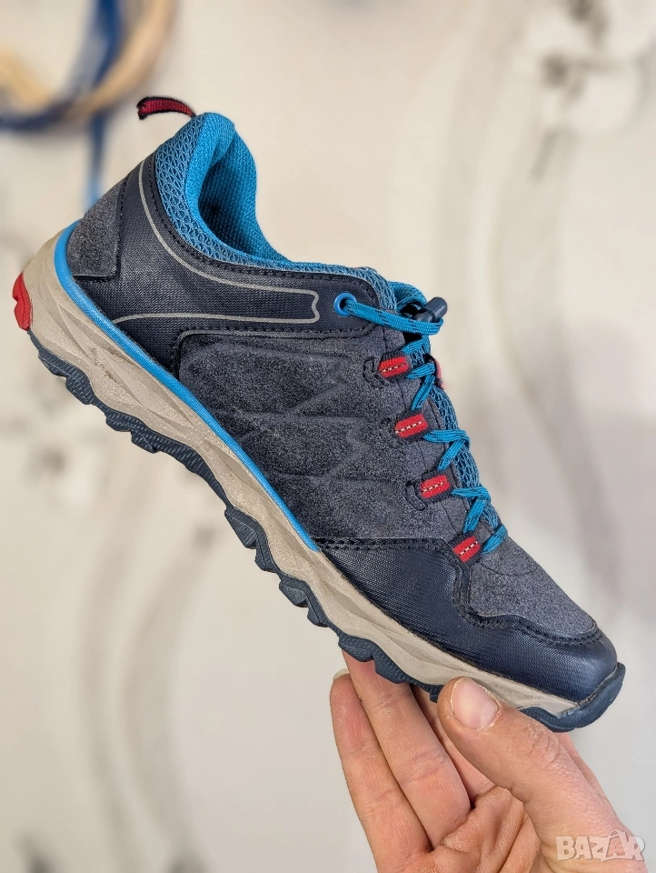 Cool trekking ниски обувки в страхотно синьо/тъмно синьо и червено, изработени от горен материал велур/мрежа и пластмаса за защита над областта на пръстите на краката. Вътрешната подплата и подвижната стелка са изработени от дишащ текстил. Здравата външна подметка с протектор е изработена от гума. Благодарение на вградената оригинална мембрана GoreTex, тази обувка е 100% водоустойчива, ветроустойчива и дишаща. Връзката с практичен цип позволява обувката лесно да се регулира по крака и улеснява обуването и събуването.