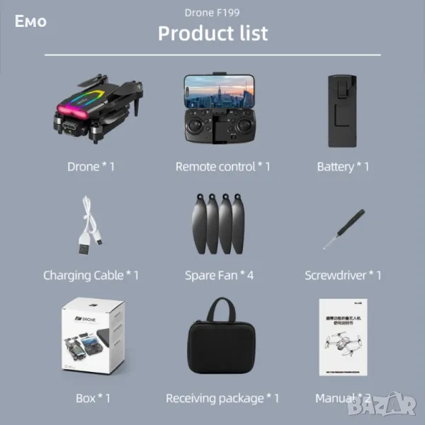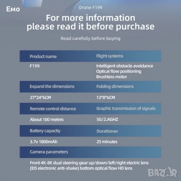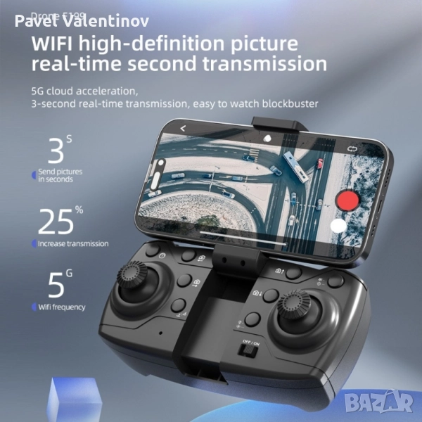 Дронът разполага и с функции като автоматично връщане, 3 скорости и автоматично поддържане на височина, които улесняват неговата употреба.