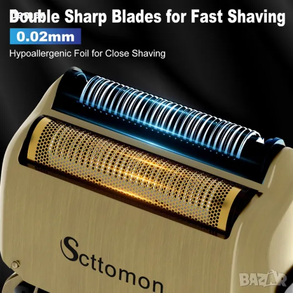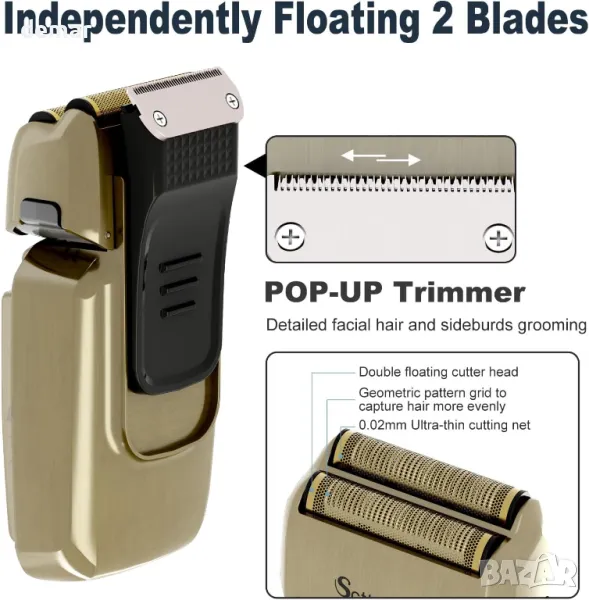 Самобръсначката с фолио и самобръсначка 2 в 1 от Scttomon е предназначена за универсално подстригване, включваща тример за брада и машинка за подстригване на плешиви, за да задоволи всички нужди при бръснене. Включва изскачащ тример за къса коса, преди да използвате бръснещата глава с фолио за оптимални резултати. Самобръсначката с двойно плаващо фолио разполага с уникален двуслоен мрежест дизайн с независими режещи остриета, минимизирайки дразненето на кожата и осигурявайки цялостно бръснене. С двигател с 8500 RPM, потребителите могат да регулират скоростите между 7000 RPM и 8000 RPM, а презареждаемата литиево-йонна батерия осигурява до 75 минути работа след 1,5 часа зареждане. Водоустойчивостта IPX6 поддържа както мокро, така и сухо бръснене, а почистването е без усилие. Интелигентният LED дисплей показва нивото на батерията, скоростта на двигателя, напомняния за почистване и включва заключване за пътуване за допълнителна безопасност. Неговият метален корпус и елегантен дизайн го правят идеален избор както за домашни потребители, така и за бръснари.