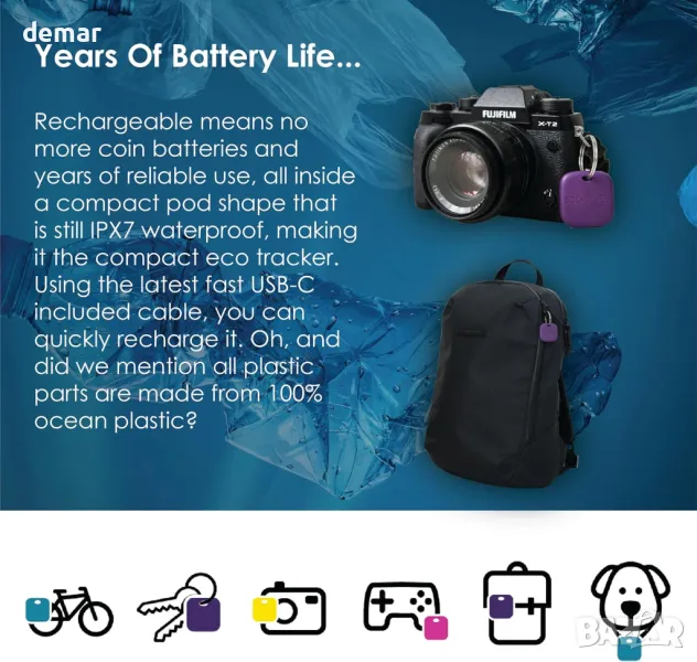 Интелигентните устройства за проследяване Boomtag са проектирани с мисъл за устойчивостта, изработени от свързана с океана пластмаса, за да помогнат за намаляване на въздействието върху околната среда. Тези универсални търсачки за предмети могат лесно да бъдат прикрепени към деца, домашни любимци, ключове, чанти, портфейли и куфари, като ви гарантират връзка с вашите ценности. С предпазна примка за закрепване на ключодържател и IPX7 водоустойчив рейтинг, те предлагат допълнителна издръжливост. Съвместим с приложенията Apple Find My, Boomtag осигурява високо прецизно проследяване, което позволява точно проследяване на местоположението, независимо дали вашият артикул е наблизо или далеч, като ви дава спокойствие по време на пътуване. Предлагани в шест стилни цвята, тези елегантни тракери разполагат със сменяема батерия CR2032 с живот от 10-12 месеца. Партньорството на Boomtag с #tide ocean SA се фокусира върху събирането и рециклирането на пластмасови отпадъци, трансформирането им в надеждни, екологични материали.