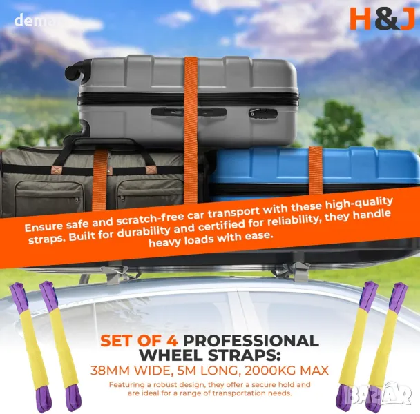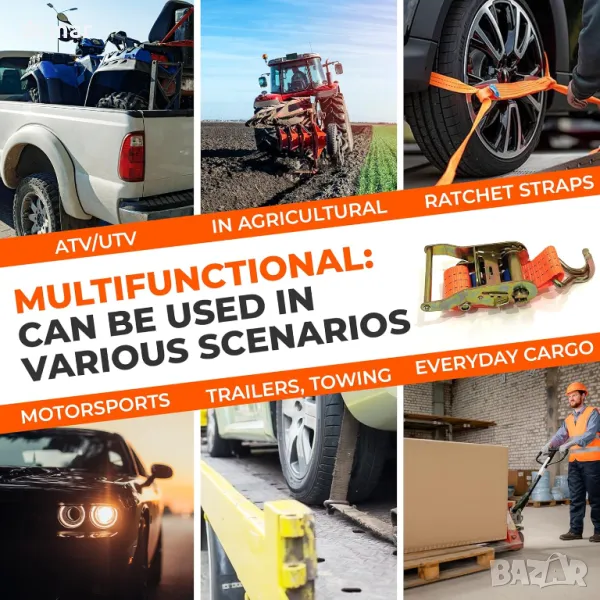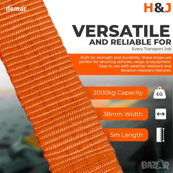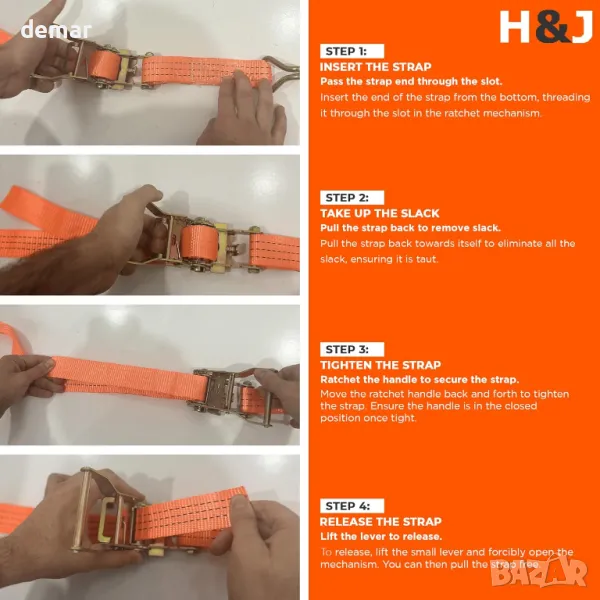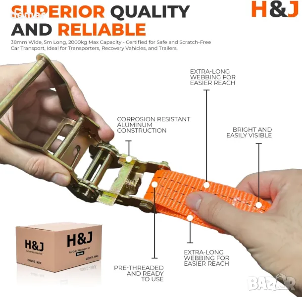 4 бр. 38 мм ремъци с тресчотка за закрепване на тежки товари, автомобили, до 2000 кг всяка, оранжеви