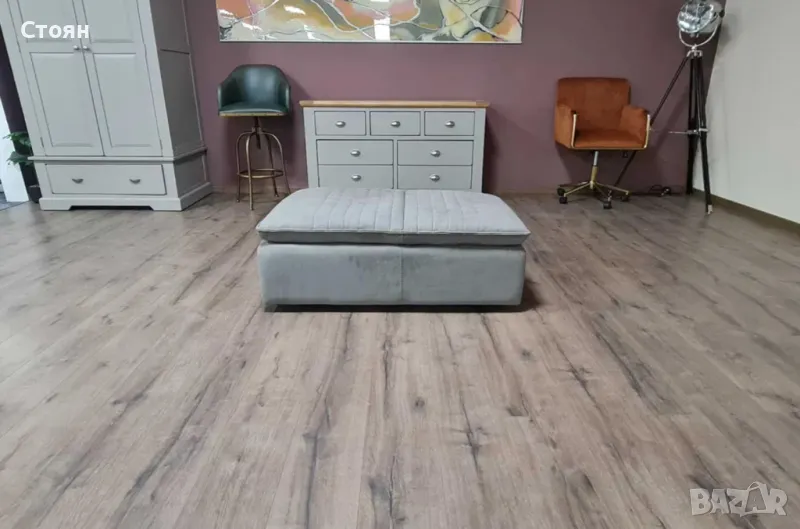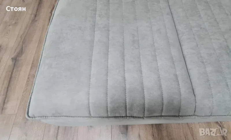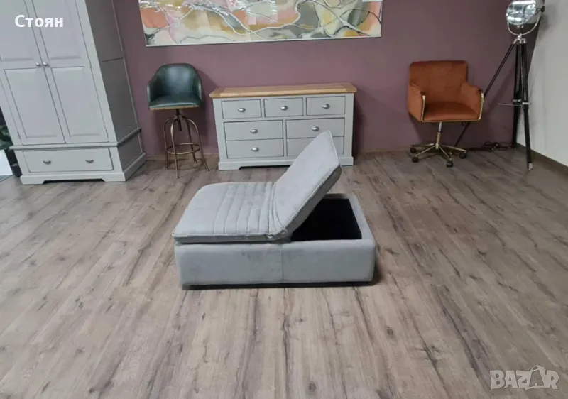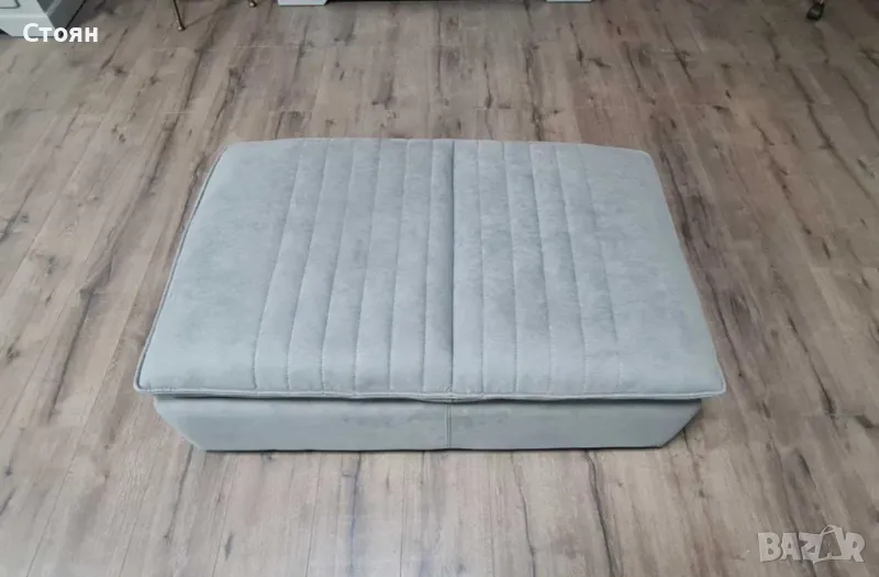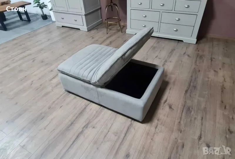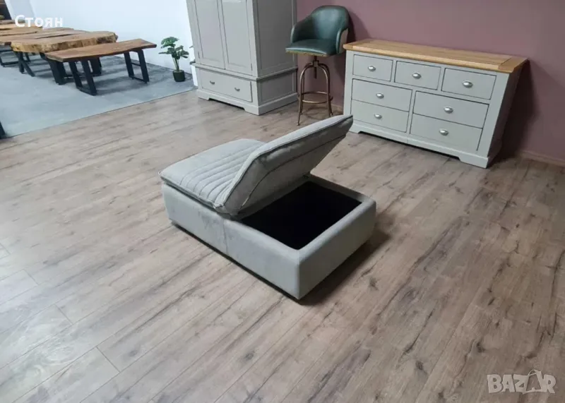 Голяма сива табуретка от плат с функция ракла. Табуретката има механизъм за повдигане от едната страна и така може да се използва за малък стол.