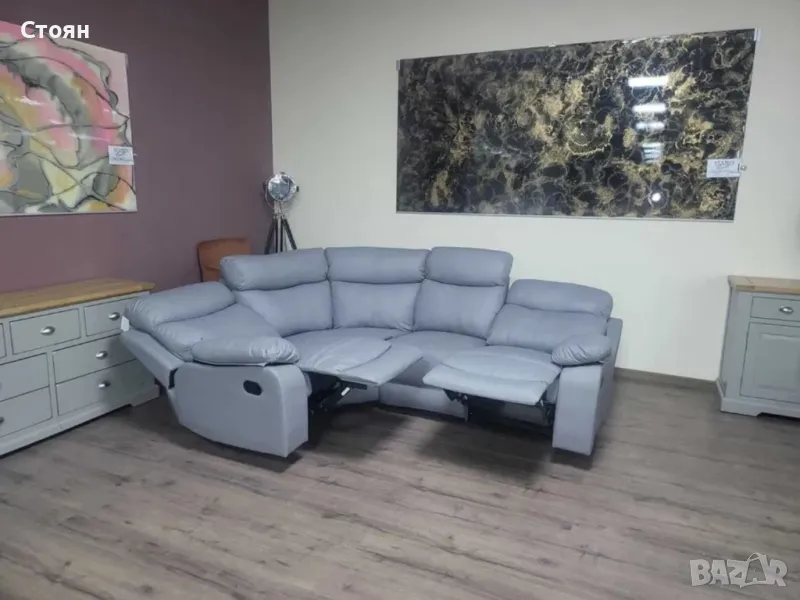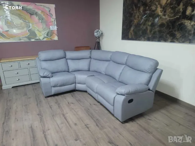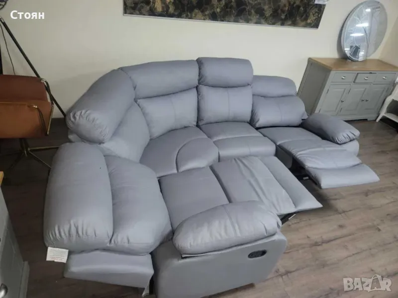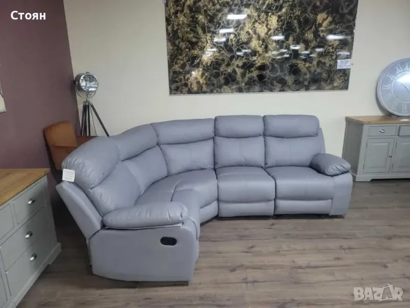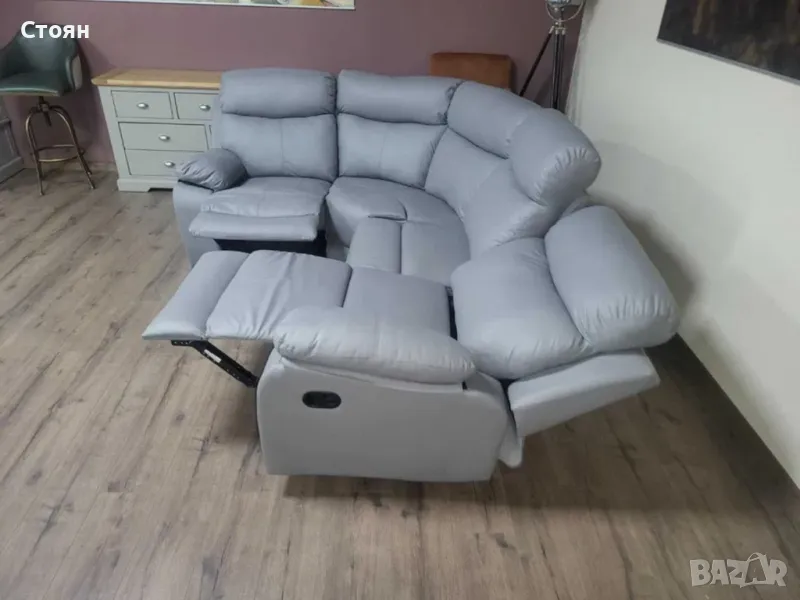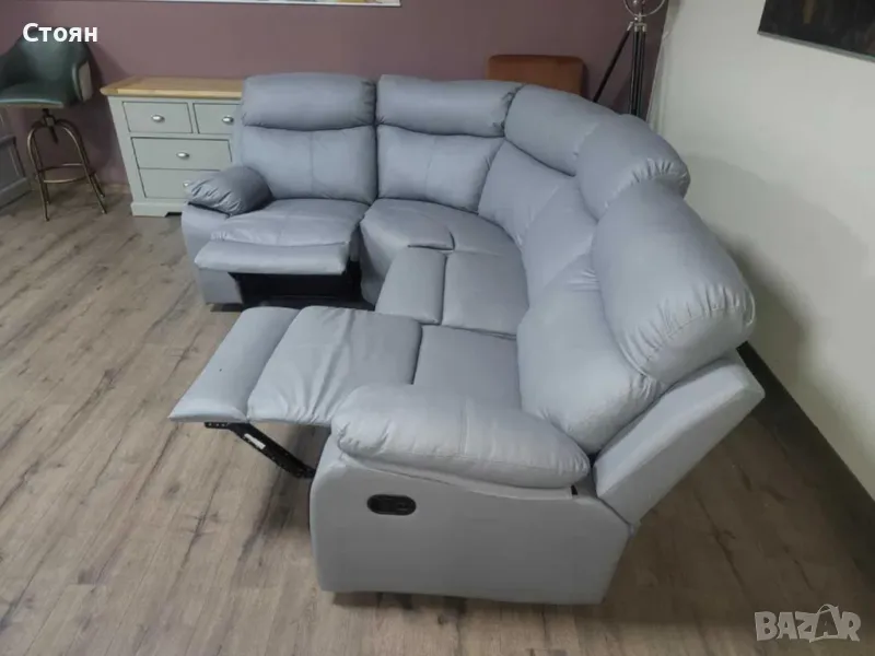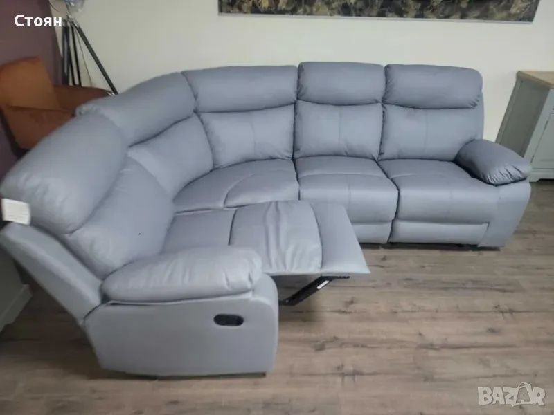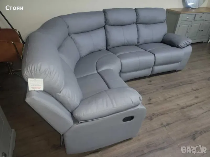 Сив кожен ъглов диван с ръчен релаксиращ механизъм на двете крайни седалки от изкуствена кожа в отлично състояние.