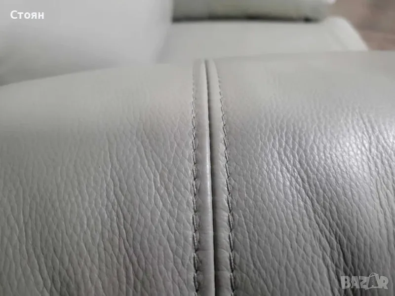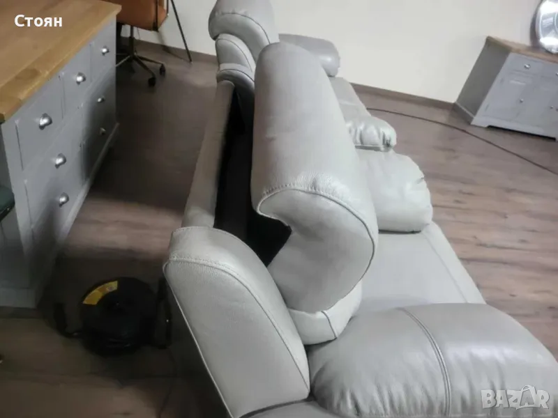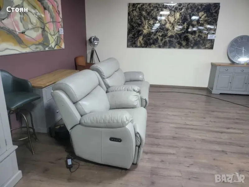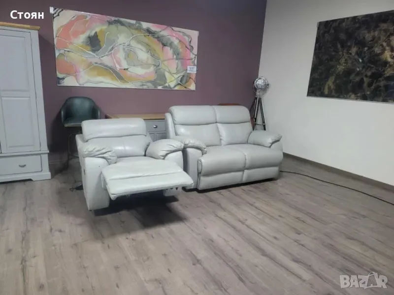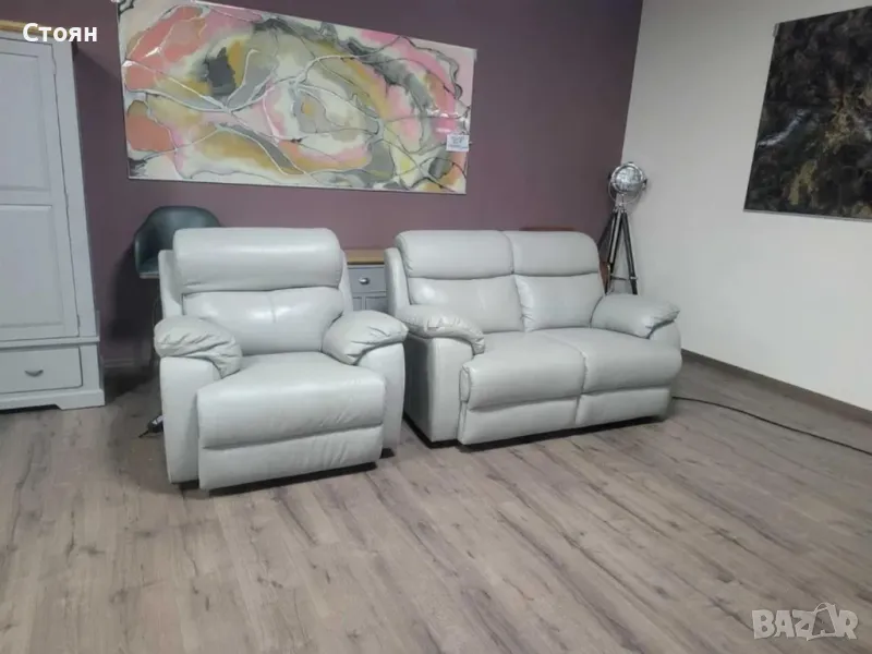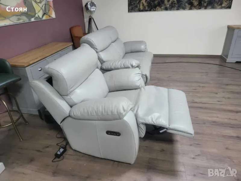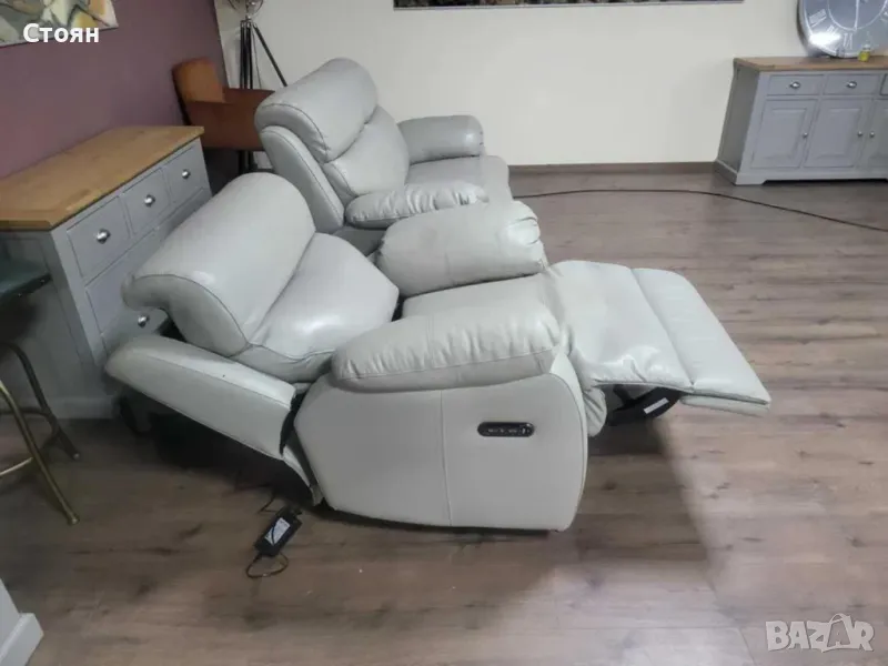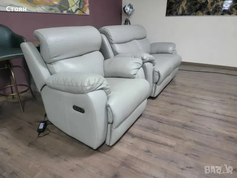Сив кожен комплект двойка и фотьойл "Grayson". Фотьойлът е с електрически релаксиращ механизъм за краката и облегалката.