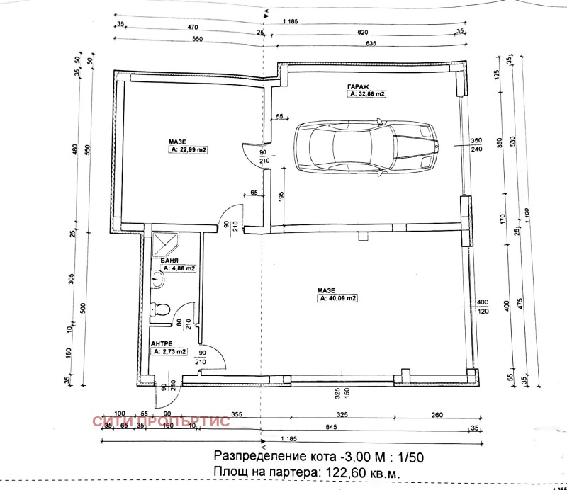 Партер състоящ се от входно антре, баня със санитарен възел, механа, гараж, мазе.