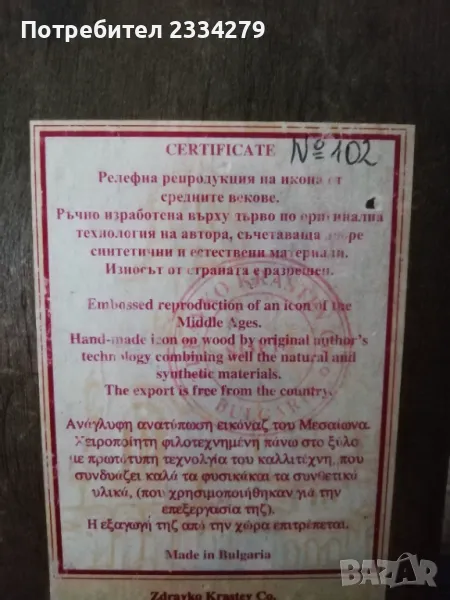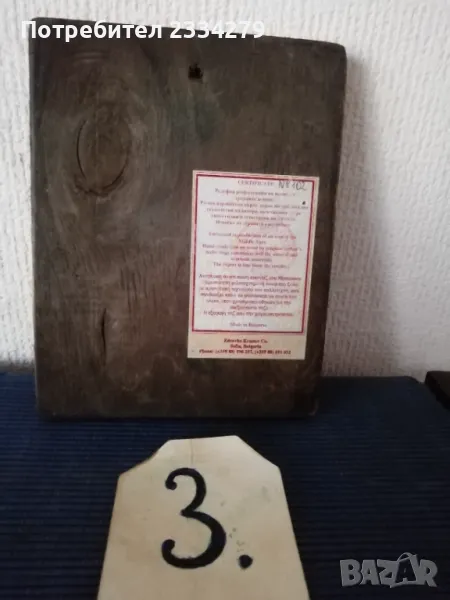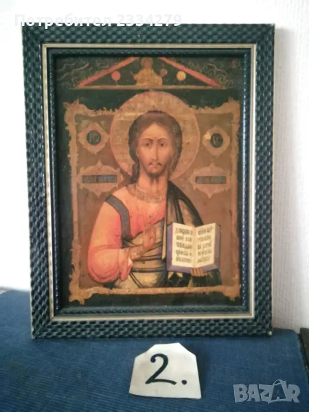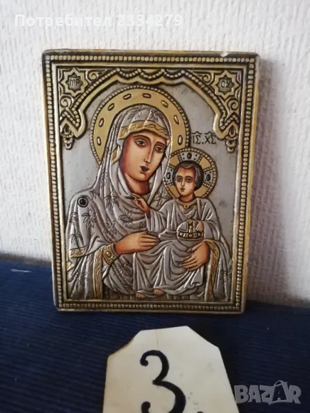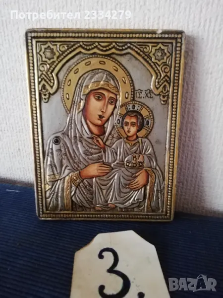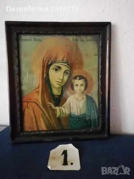N:1 Стара икона ,,КАЗАНСКАТА БОГОРОДИЦА" поставена в остъклена орнаментирана рамка с размери: 28х34см., 100%автентичност, цена 20.; N:2икона на ,,Светия" поставена в красива орнаментирана рамка с размери: 30х40см.,цена 15€.; N:3 релефна репродукция на икона от средните векове, авторска със сертификат и размери: 18х14см.,цена 10€.;
