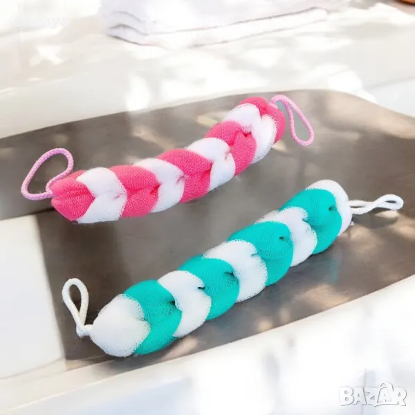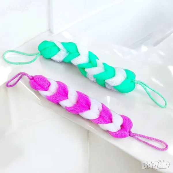 Супер разтеглива изтривалка за гръб тип плитка. Мрежеста гъба с дръжки по краищата си, идеална за почистване и екфолиране на гърба по време на душ. Свежи ярки цветове – зелен, розов, динен, оранжев, тюркоаз, син цвят, съчетани с бяло.
