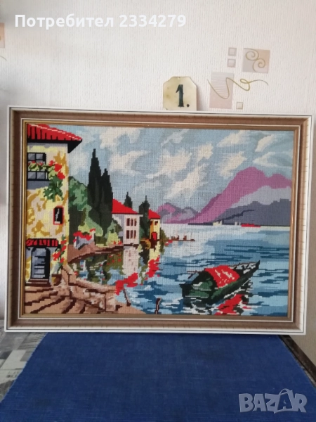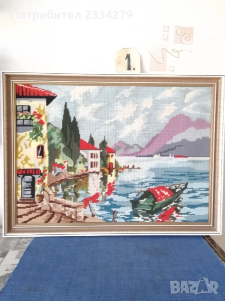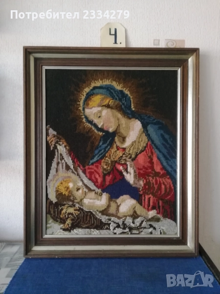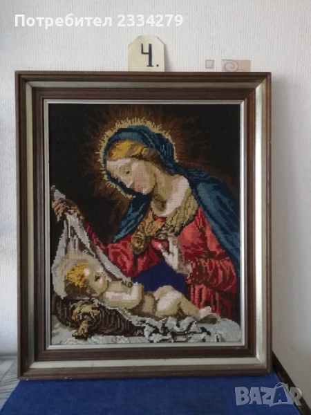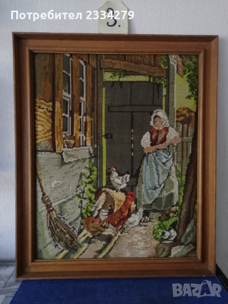 дървени рамки. Ушити с гобленов бод 1:1 на панама с ДМС конци. N:1 гоблен ,,МОРСКИ ПЕЙЗАЖ" разпънат на орнаментирана дървена рамка с размери 61х45см., цена 21€.; N:2 (НЕ Е НАЛИЧЕН) ; N:3 гоблен ,,селски мотив" поставен в орнаментирана дървена рамка с размери 58х50см., цена 27€.; N:4 красив стар гоблен ,,МАРИЯ С МЛАДЕНЕЦА", поставена на орнаментирана дървена рамка с размери: 55х47см., цена 43€.