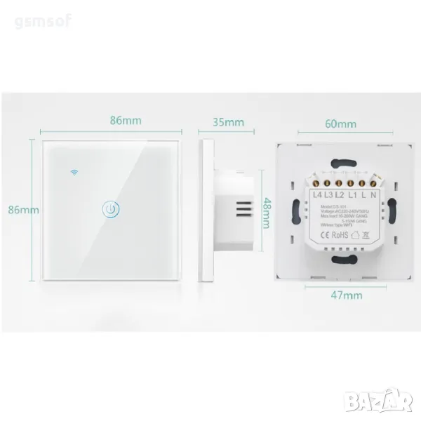 Tuya Smartlife - WiFi сензорен ключ за осветление (единичен), без нужда от 0 проводник бял