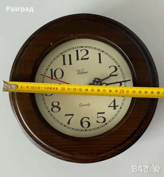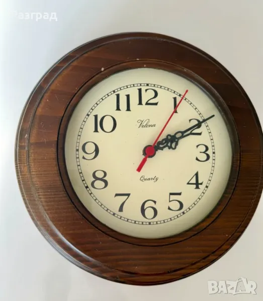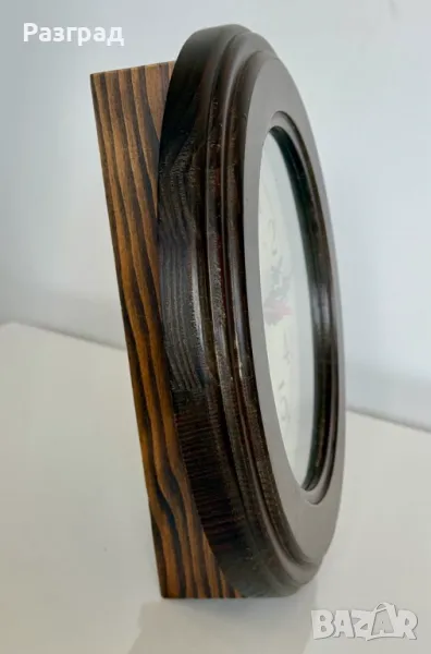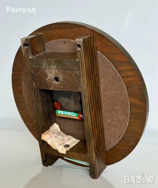 Винтидж кварцов часовник с дъбов корпус в класически дизайн от 60-те години. В добро винтидж състояние, има дребни драскотини по дървото. Работи отлично. Подходящ е за окачване на стена. Диаметър 26см.