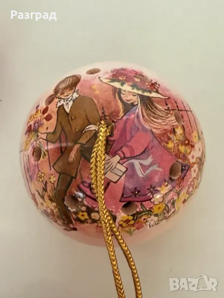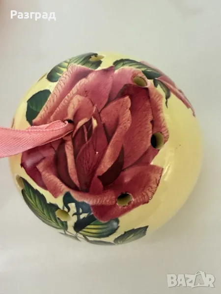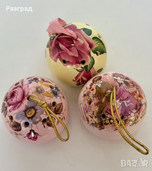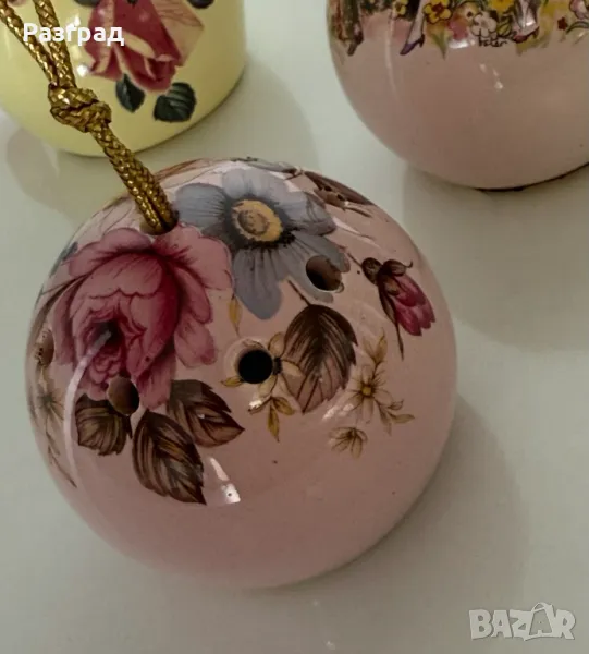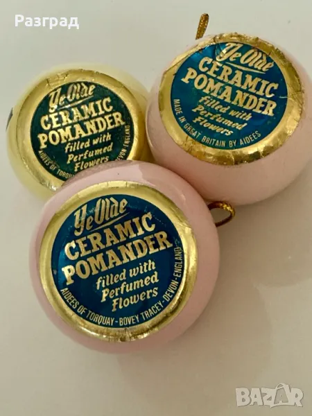 Комплект от три красиви английски помандъра с връвчици за окачване. Винтидж английски порцеланови ароматизатори. Произведени 1970г в Англия. Пълни с ароматни цветя и запечатани с хартиен етикет на дъното. Без дефекти и в чудесно винтидж състояние.