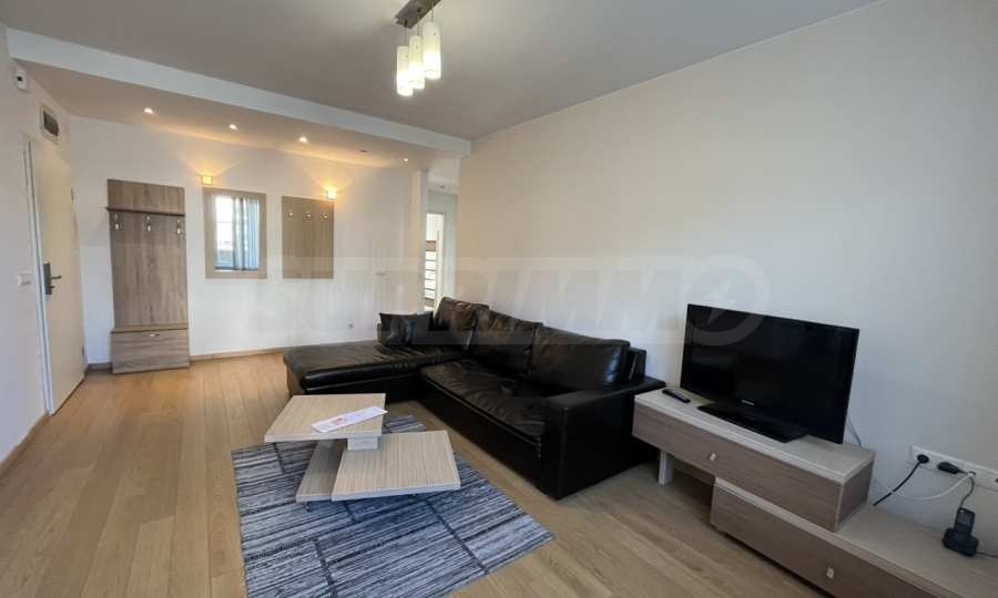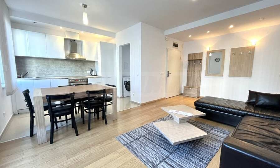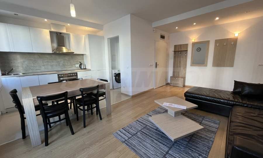 Жилището е с индивидуален дизайн, с голямо внимание към детайлите. В декорацията са използвани само най-висококачествените и естествени материали. Просторната всекидневна разполага с мека мебел и бяла кухня, която е напълно оборудвана с висок клас техника: фурна, котлони и хладилник.