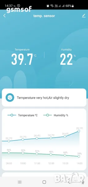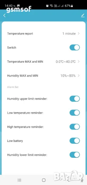 Алармена сигнализация от датчика и приложението при температура и/или влажност извън зададените от потребителя диапазон. (от мин -10 до макс 55 градуса за температура, 0-99%RH за влажност).