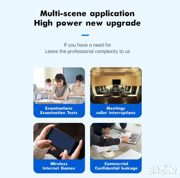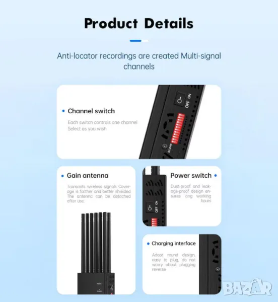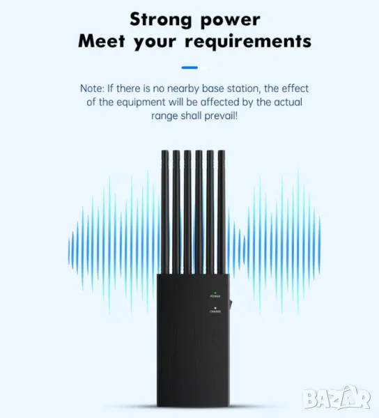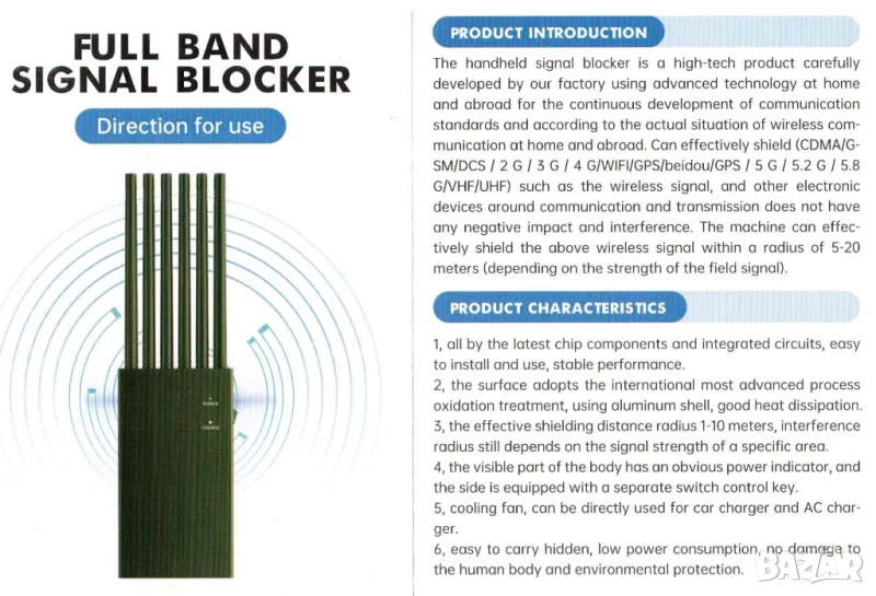 ВАЖНО: Посоченото максимално ефективно разстояние е за открити площи без прегради/стени, и ВИНАГИ зависи от силата/мощността и отстоянието между заглушителя и радио-честотния предавател. Същият занижен ефект да се очаква, и при наличието на няколко стени/етажни плочи, арматура, метални прегради и конструкции /гипсови/, или други екраниращи материали.