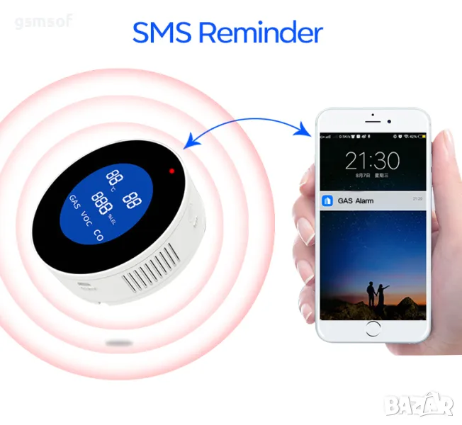 WiFi датчика ще ви информира незабавно на телефона, при изтичане на газ (пропан-бутан или метан) в помещението където е поставен. По този начин ще бъдете максимално бързо информирани, ако има изтичане на газ в дома. WiFi алармения датчик работи индивидуално. Не е нужно да бъде свързан към СОТ или някакъв друг модел алармена система. Принципът му на действие, е че може безжично да бъде синхронизиран да работи с WiFi мрежата в домa ви. Всичко това става през смарт телефон. Програмата която се използва за телефон е Tuya или Smartlife.