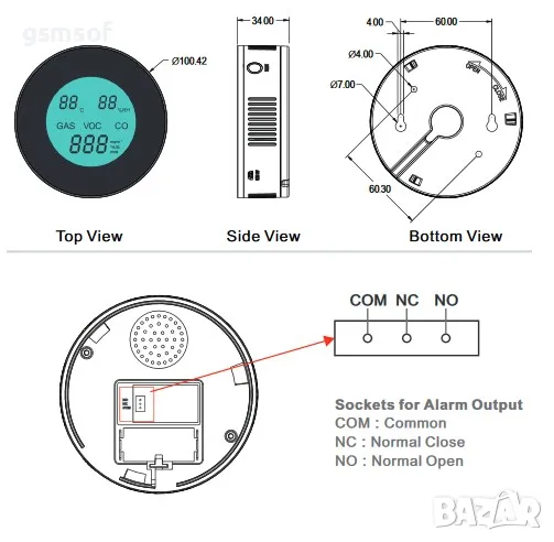 Допълнителни екстри: LCD дисплей показващ темепература на въздуха, наситеност на газ в %, обхват към WiFi рутера. Снабден със звукова сигнализация и тест бутон. Пробата на датчика може да се извърши най-лесно с изтичане на газ от запалка. Когато концентрацията на газ в датчика достигне 8%, алармения датчик задейства звуквата си сирена и известява на телефон през приложението Tuya или Smartlife.