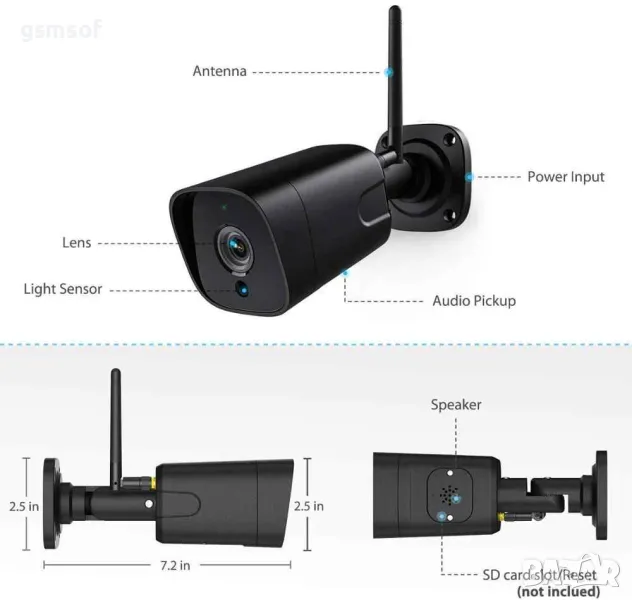 Комплекта включва: 5mpx WiFi камера, захранващ адаптер 12v 1A, инструкции на български за синхронизирането на камерата към рутер, крепежни елементи.