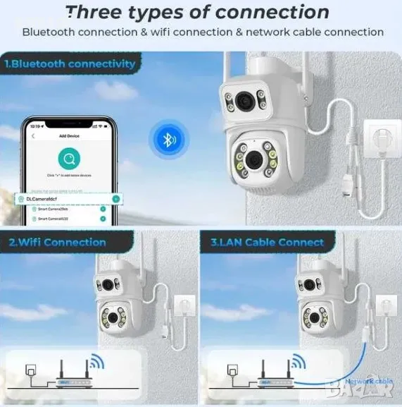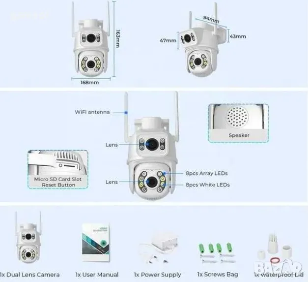 Комплект: А8Q WiFi камера с два обектива, захранващ адаптер, инструкции на български за свързване към WiFi рутер, свързващи елементи.