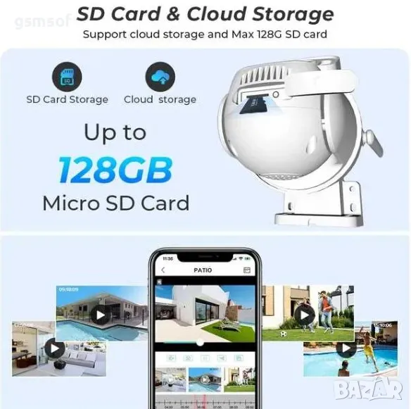 Режими на запис: постоянен, движение на обект, движение на човек. Нощен режим: черно-бял нощен, цветен нощен, цветен само при движение. Опции за допълнителна настройка на нощното видео. Записа на видео-файловете се осъществява на карта памет Microsd, като същите могат да се преглеждат от приложението на телефона без да е нужно изваждането и от слота. Максимален капацитет за MicroSD карта - до 128Gb. Запис и наблюдение от компютър през приложението CMS. Възможност за отключване на облачна услуга (платена опция).