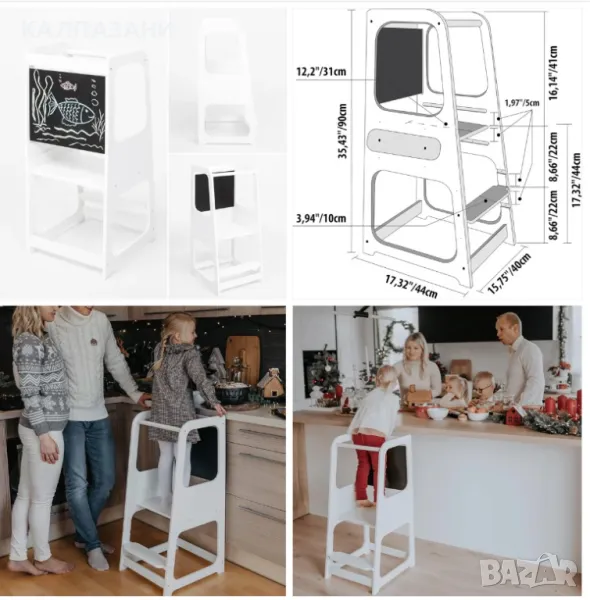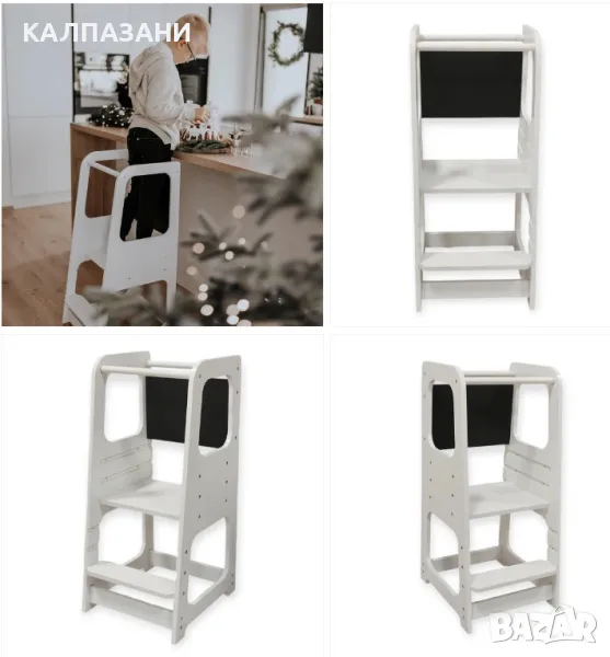 - Дизайнът на кулата е съобразен с принципите на Монтесори, насърчавайки децата да бъдат самостоятелни и да участват активно в различни дейности в домакинството. Това образователно столче стълба е идеално за ползване в кухнята, като позволява на децата да се включат в приготвянето на храна, миене на съдове и други домашни задачи, развивайки техните умения и увереност.