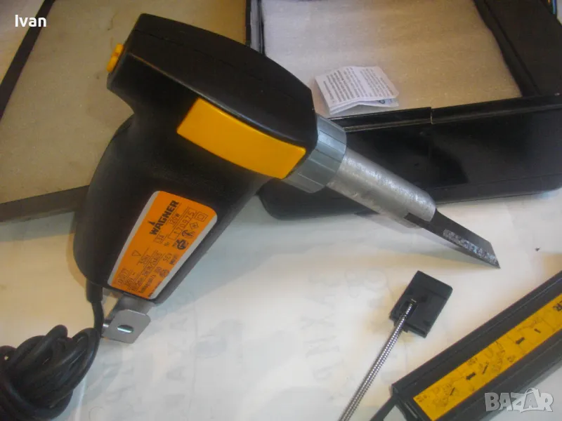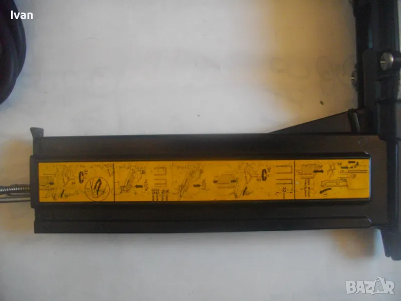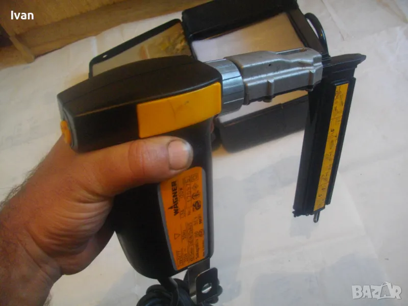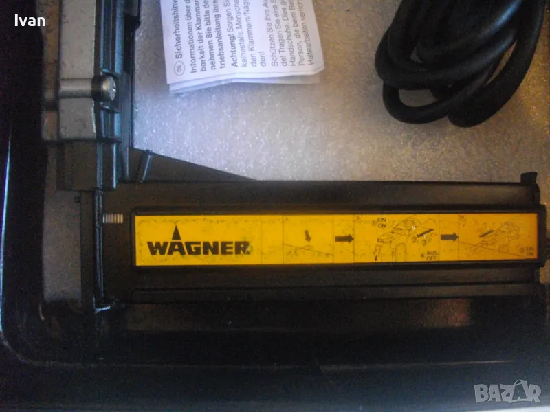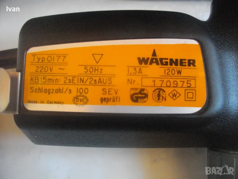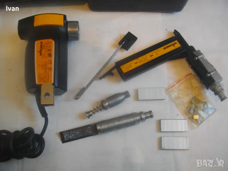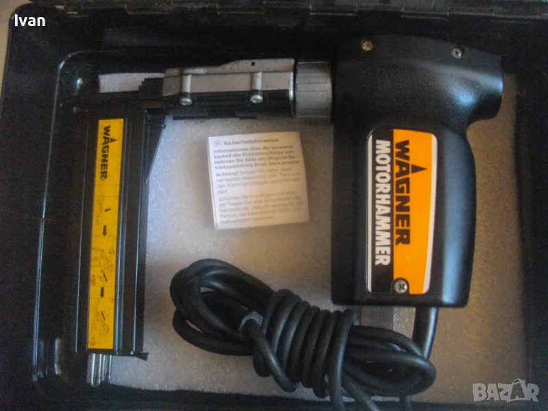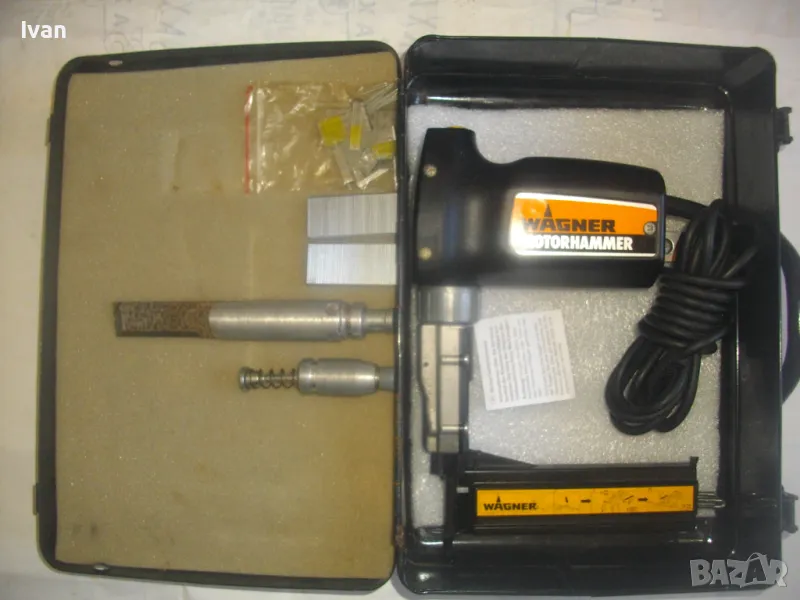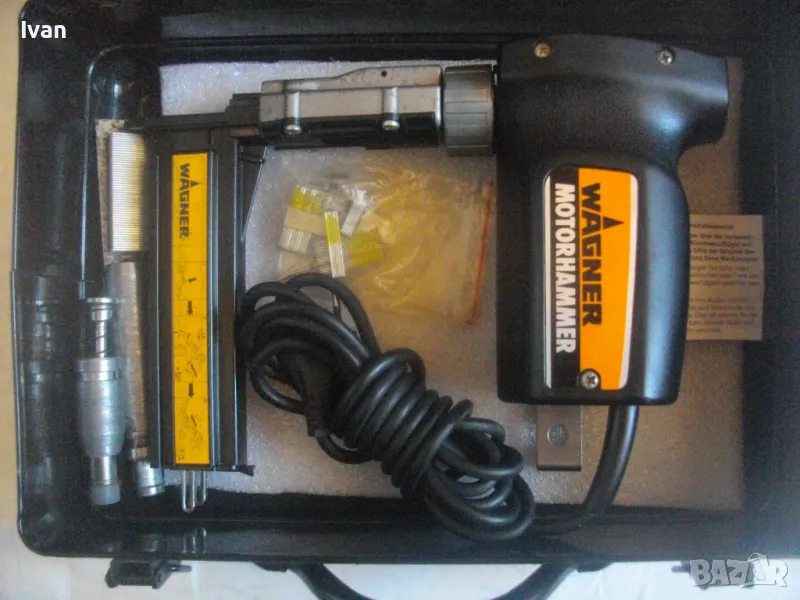 ОПИСАНИЕ на електрически комплект WAGNER ел. такер за скоби и ел. длето за стружуване - цена 299 лв. Марка и модел на машината WAGNER Motorhammer Typ 0177. оригинален немски Madе in Germany . Захранване 220 V, време на работа с 1 пуск - KB 15 min, мощност 120 W, защита 1,3 A. Комплектът е почти нов, като нов, с много запазен външен вид и отлично работно, механично и техническо състояние. Без забележки. Включва машината, 1 приставка такер за скоби до 25 мм дължина, с пълнител и капачка на него и зареден блистер скоби 25 мм за проба и тест. Отделно втора приставка в комплекта ел. длето за стружуване ширина на длетото 22 мм, масивно и ббез никакви наранявания на острието. Длетото е ново, стояло е неизползвано. Дветет приставки са със своите бутала и пружини. Отделно в комплекта резервно бутало и торбичка със скоби за такера. Модела машина работи като такер със скоби 2 различни типа - с дължина 16-25 мм. Широк голям удобен страничен пусков бутон на машината. Кука метална за закачване на строителен колан при работа. Куфар метален оригинален черен с размери 315 х 225 х 110 мм, с метални дръжка и закопчалки. Тегло на комплекта - 4,0 кг. Цена на комплекта в описания вид - 299 лв.