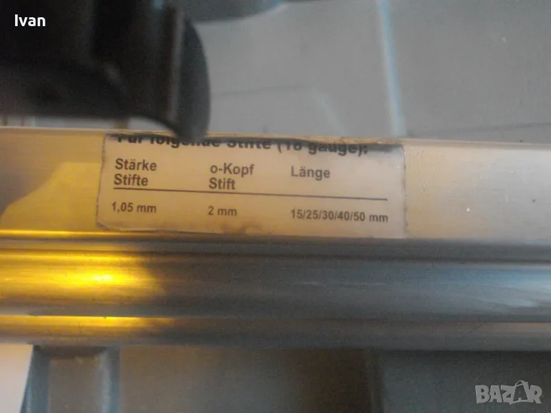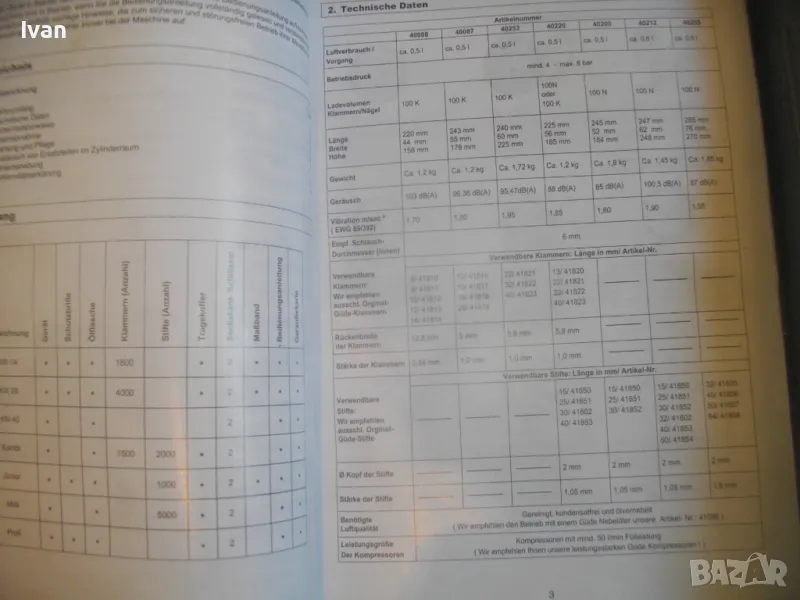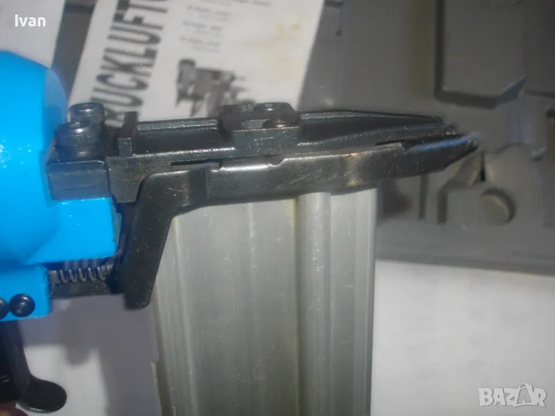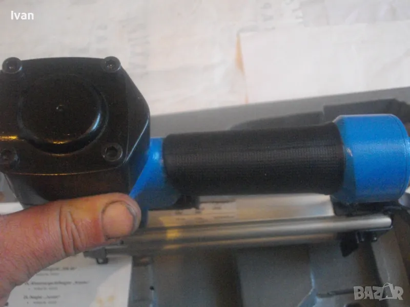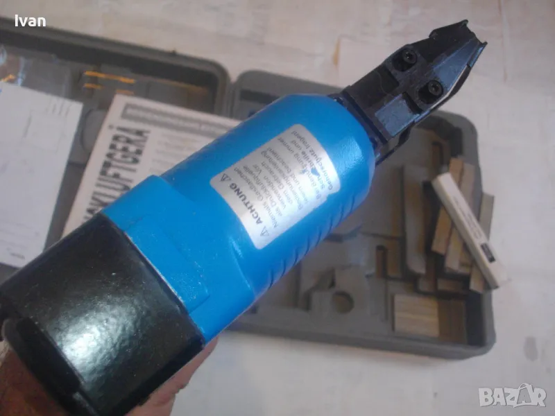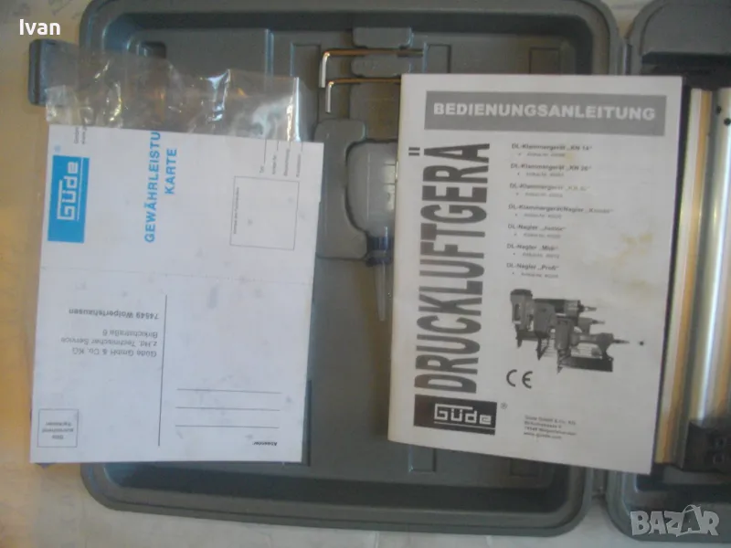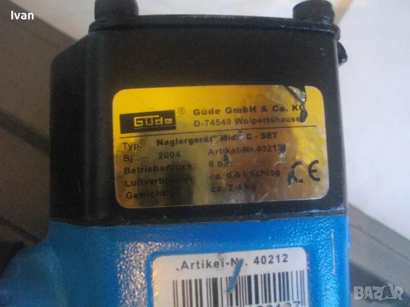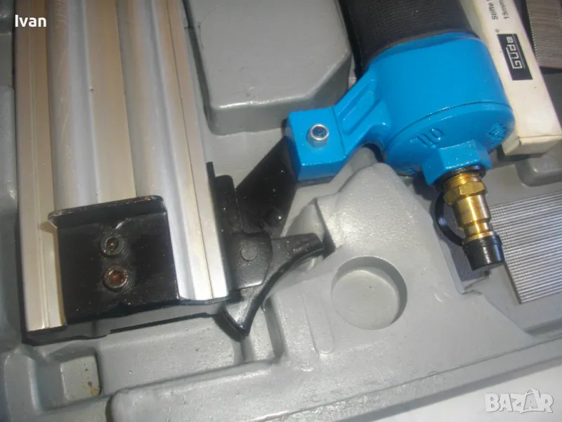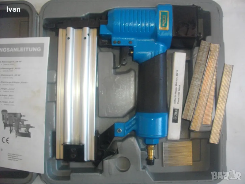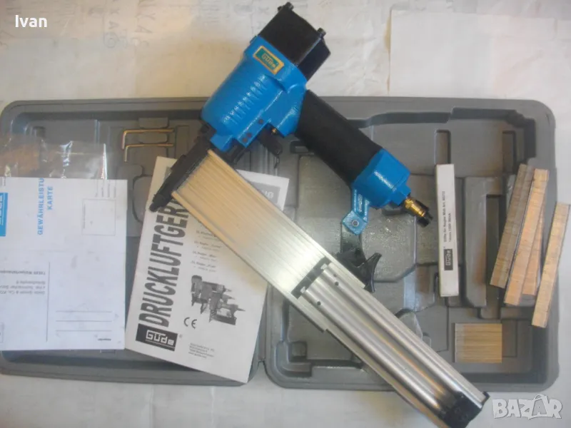 ОПИСАНИЕ на пневматичен такер ГУДЕ в сив куфар - цена 259 лв. Немски оригинален като производство 2004 г. Марка и модел GUDE D-7459, налягане до 6 bar, тегло на машината само 2,4 kg, производител Gude GMBH. Такера е с много запазен външен вид иотлично работно състояние, със силен и мощен удар. Почти нов. За консумативи дърводелски тапицерски пирони с дължина до 50 мм. Масивна глава от закалена инструментална стомана. Гумирано нехлъзгащо се покритие на дръжката, голям масивен алуминиев пълнител, поставен щуцер бърза връзка за скачване с компресор. Към комплекта са налични оригиналните книжки техн.документация на машината, масльонка, 2 бр. шестостен ключове за главата на такера, кутия на марката с 5 бр. блистери къси пирони 15 мм, отделно има половин блистер дъли пирони 50 м за проба и тест. Тегло на комплекта - 2,9 кг. Цена на комплекта - 259 лв.