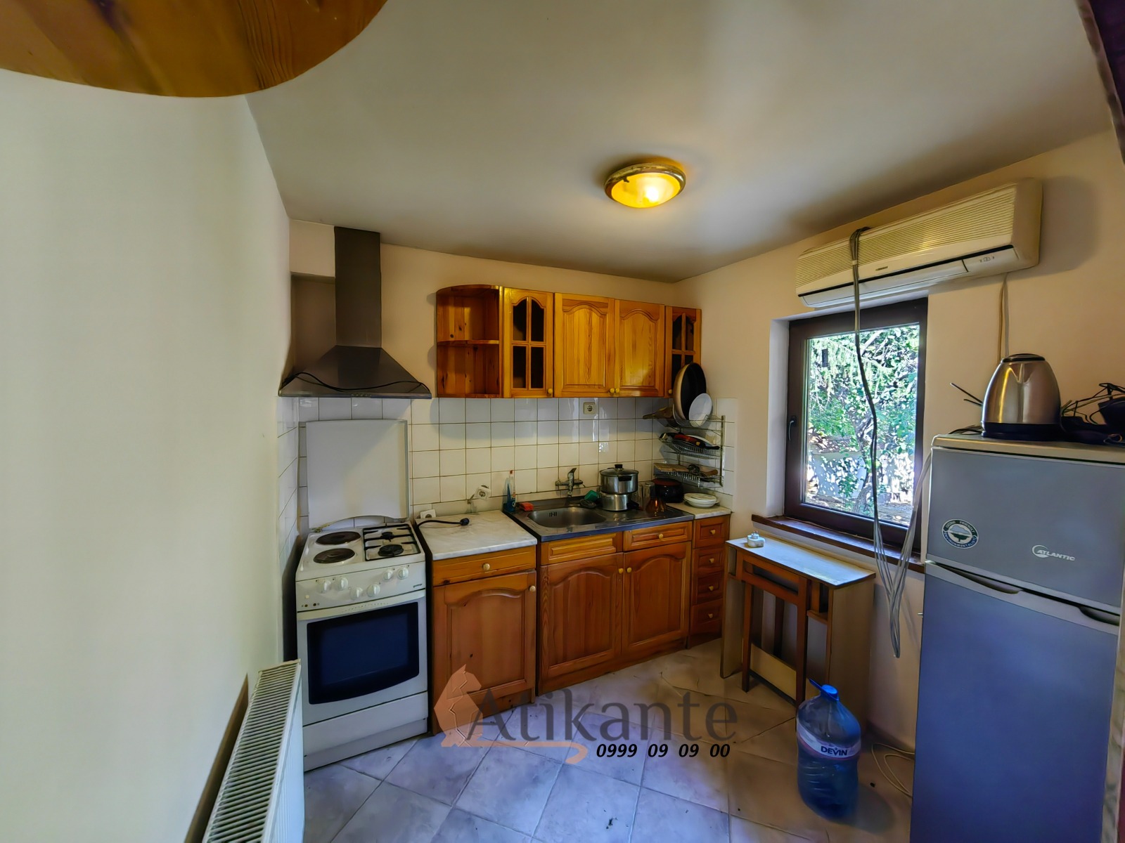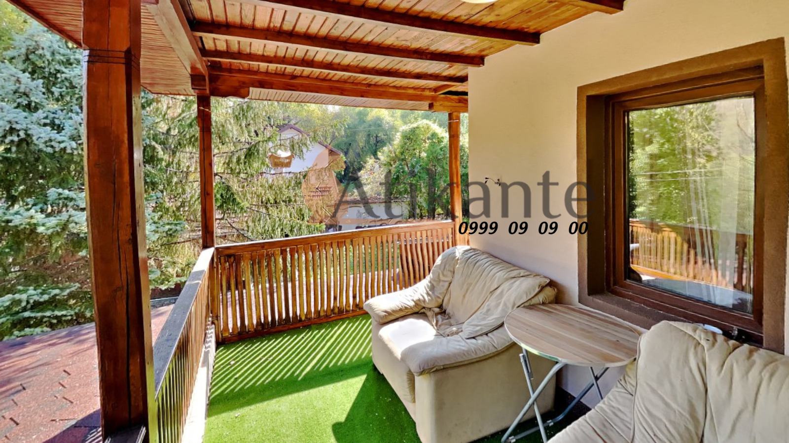 дърворезба. А пред нея голям дървен навес с лятна градина. Оборудвана кухня, сервизно помещение и голяма баня с тоалетна. Още едно помещение с тоалетна и летен душ. Настилката на етажа е гранитогрес.