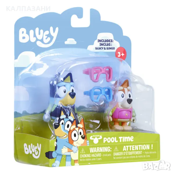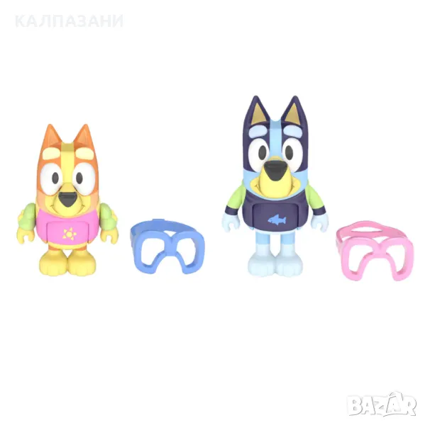 Облечени по бански, Блуи и Бинго са готови за водни забавления. Сложи очилата за плуване на кучетата и скочете във водата! Пресъздадай истории, познати от анимациите, и създадай свои собствени истории с въображение.