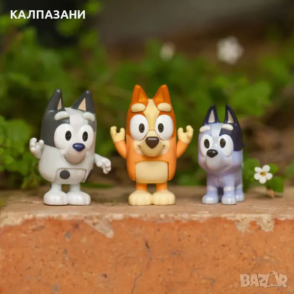 Комплект от три подвижни фигурки на кучета от анимационния сериал Блуи. Бинго днес играе със семейството си - братовчедите Мъфин и Сокс. На кучетата със сигурност ще им хрумне някоя луда идея! Пресъздадай истории, познати от анимациите, и създадай свои собствени истории с въображение.