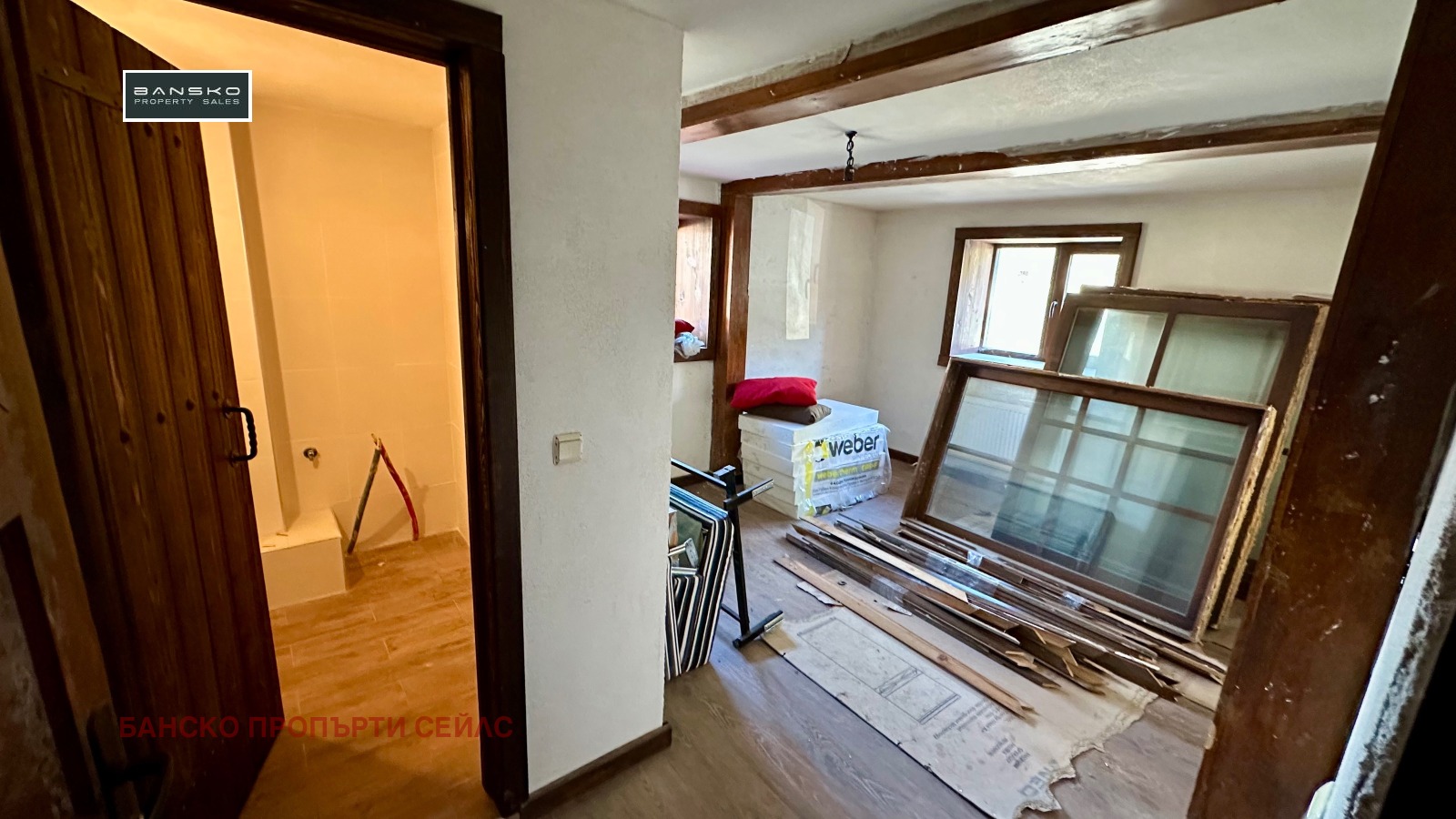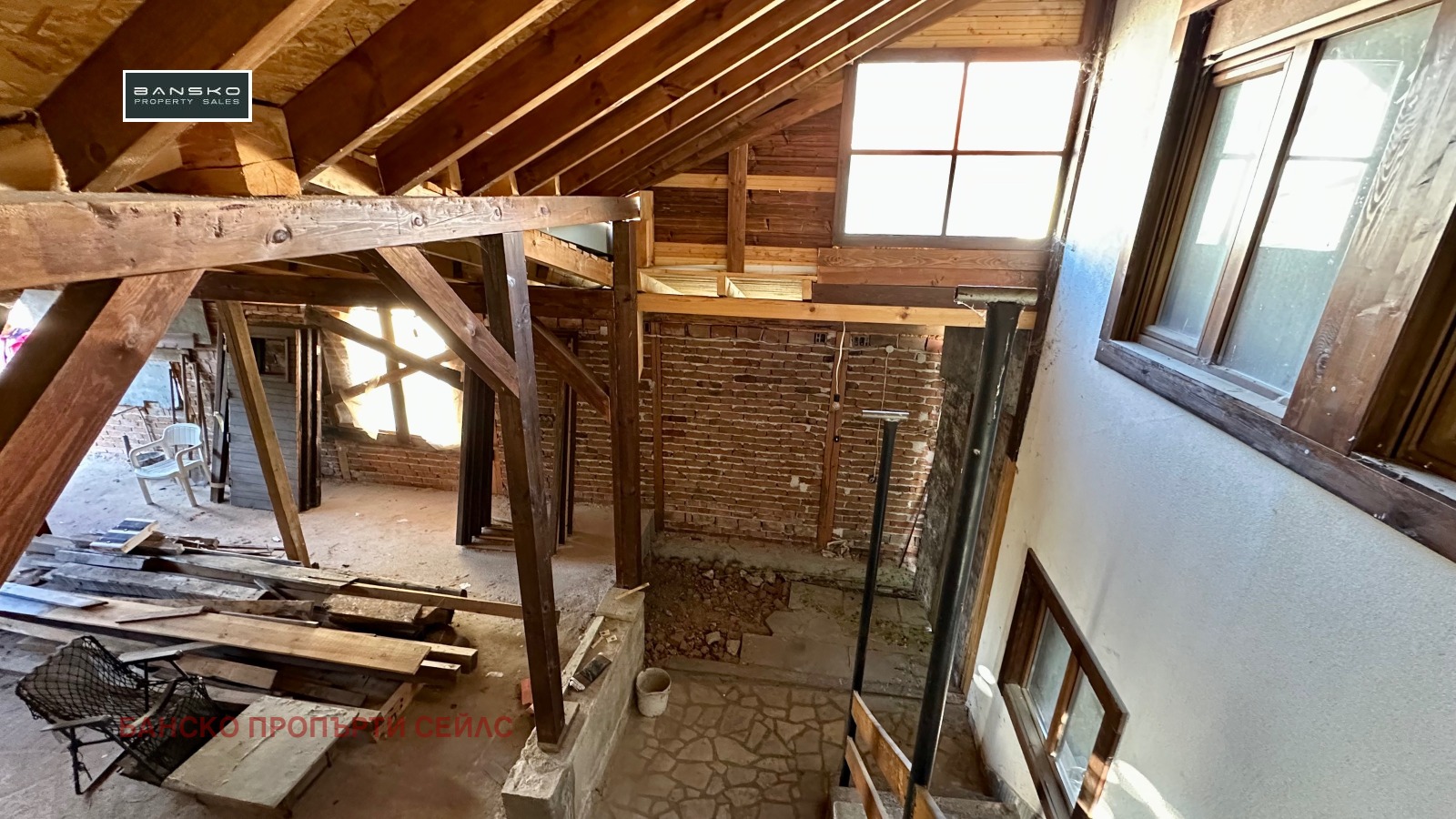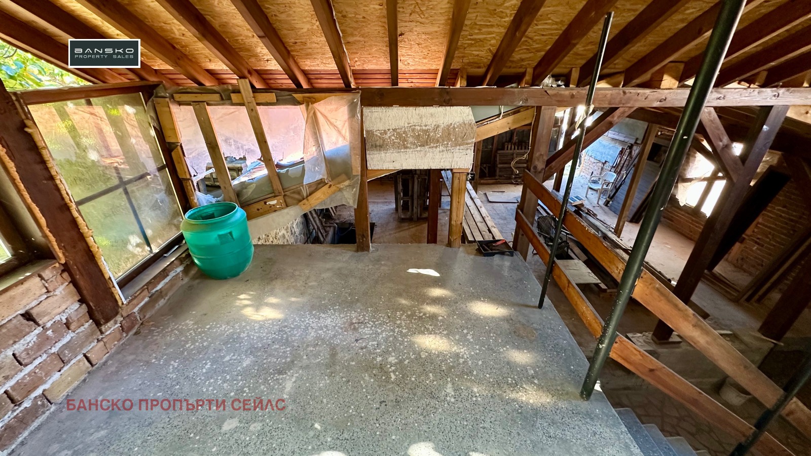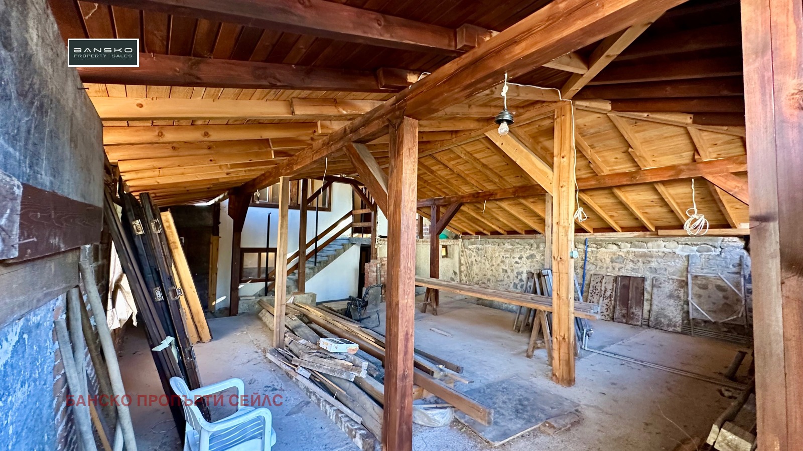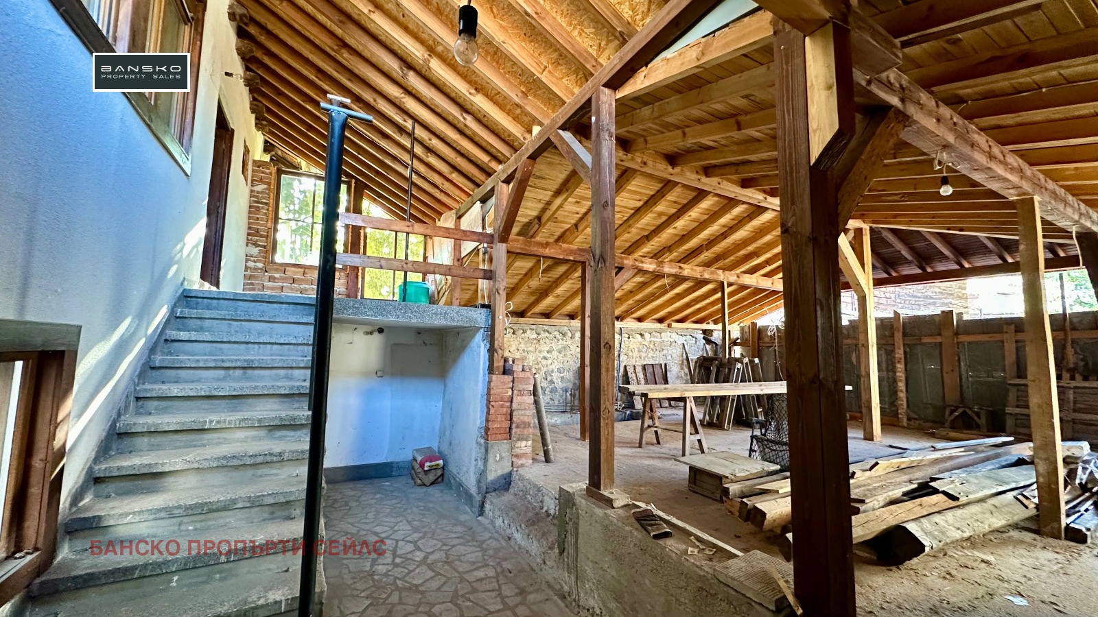 🔴Механата - дневна-кухня е изградена на груб строеж, с нова дървена покривна конструкция и ограждащи зидове , подведени са комуникации - ток, вода, парно, дограмата е налична-дървен стъклопакет, не е монтирана.