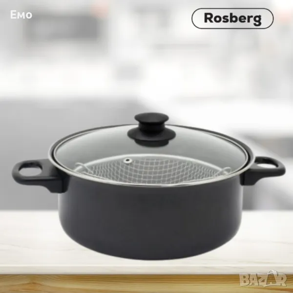 Тенджера с кош за пържене Rosberg- Изработена от въглеродна стомана- Вътрешно незалепващо покритие- Външно покритие устойчивo на високи температури и корозия- Капак с отвор за пара- Подходяща за газови, халогенни, електрически и стъклокерамични котлони- Лесна за почистване и удобна за употреба- Безопасна употреба, не съдържа PFOA химикали, позволява здравословно хранене- Диаметър: 24 см- Капацитет: 4 литра