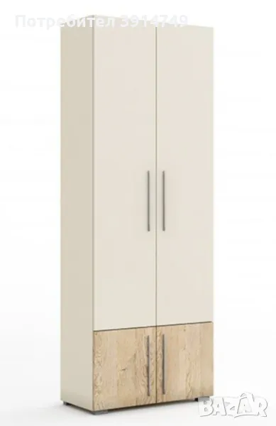 Гардеробът е ползван и е в добро състояние с 2-3 малки козметични дефекти по краищата на плотовете, които не се виждат от външната страна на гардероба. Изцяло от ПДЧ. Цветът е средно кафяво с принт подобаващ дъб, размерите са: височина 180 см, широчина 90 см, дълбочина 75 см. И двете подразделения са двукрилни шкафове без допълните вътрешни подразделения (няма рафтове, чекмеджета и т.н.). Горната част е с лост за закачалки за палта, сака, ризи и пр.; долното е шкаф за, например, обувки и пр.