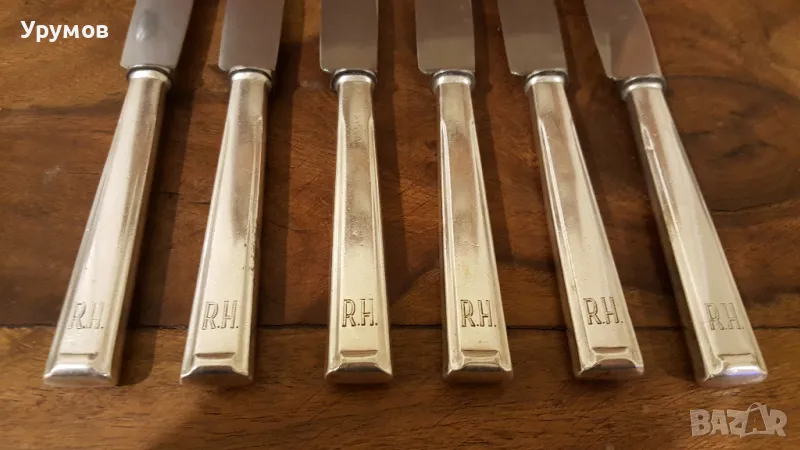 Сет от 6 броя трапезни ножове Bruckmann, произведени през 40-те години. Дълбоко посребрени дръжки маркирани с клеймо 90. Монограм на дръжките „R.H.“ Остриета от неръждаема стомана всичките маркирани с „W“ за Gustav Wirth от Solingen-Graefrath върху Nicht Rostend. Обща дължина на ножовете – 21 см. Острие - 11.5 см. Ножовете са употребявани, с нормални следи от употреба. Не са почиствани и полирани. Предлагат се в състоянието, в което са купени.