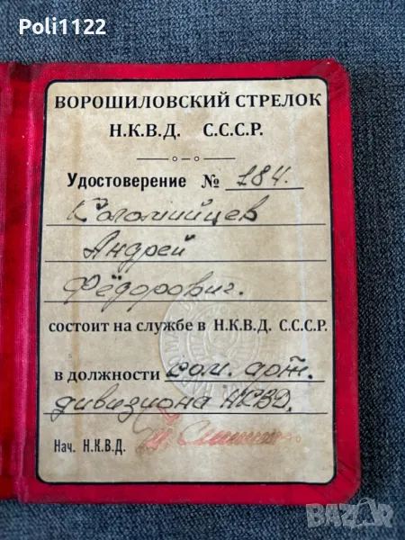 Удостоверение Ворошиловски Стрелок Н.К.В.Д. СССР.