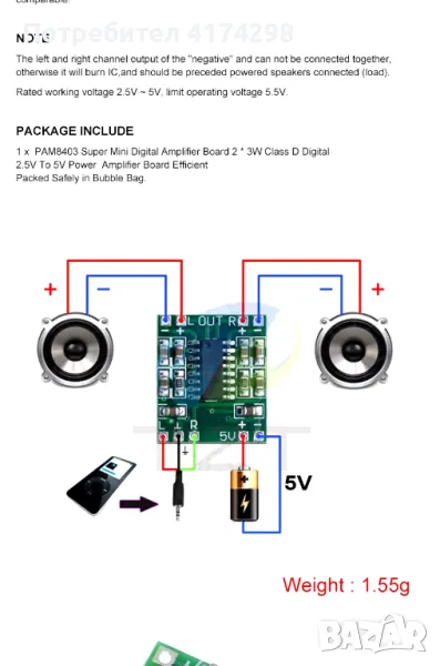 PAM8403 Зелена характеристика: Модел: PA8403 Мощност: Ниска мощност Супер размер: 1,85 * 2,11 см Отлично потискане на шума, при липса на обстоятелства, свързани към входното аудио ухо близо до високоговорителя не може да чуе никакъв шум, двуканално стерео, 5V захранване може да извежда 3W 3W мощност, може директно да управлява 4Ω, 8Ω малки високоговорители, изходната мощност голяма, пълен с енергия, добро качество на звука. Уникалната цифрова платка за захранване Class-D без LC филтър може да се използва директно компютърно USB захранване. Окабеляването с двоен панел, окабеляването правилно разрешава потенциала на заземяването, причинен от баланса и междуканалните кръстосани смущения, ултра-миниатюрен дизайн, може лесно да бъде поставен в различни цифрови продукти в малко пространство, висока ефективност на усилване. Всичко това използва машина за заваряване на цялата плоча, качество на заваряване, сравнимо с неръчен поялник! Често срещани проблеми на клиента: 1, 2 * 3 w миниатюрен цифров усилвател на мощността платка клас D захранване може ли да използва компютъра? Отговор: платката на усилвателя на мощността може да използва компютърно захранване, но може да произвежда шум (също така някои клиенти не се появиха мърморене), най-добрият съвет за независимо захранване. 2, миниатюрен цифров 2 * 3 w клас D усилвател на мощност платки с високоговорителя на къщата е добър? Отговор: нашият високоговорител е само предоставя "направи си сам" играчите опитват, звукът не е особено добър, ако преследването на висок звук клиентът може да закупи отделно. 3, 2 * 3 W миниатюрен цифров усилвател на мощността платка клас D защо има шум след включване на високоговорителя? Отговорът: 1. появяват се свирки, трябва да бъде аудио входната линия, въвеждането на екраниран проводник трябва да се използва за аудио входна линия и след това има аудио входна линия, която не е затворена, за да свърже добър аудио източник. 2.is вид причина може да е, че някои източници на захранване са лоши, смущенията са много големи, превключвайте захранването. Добро потискане на шума, при условие на свързания входен звук, ушите също не могат да чуят никакъв шум на високоговорителя, двуканално стерео, 5 v захранване може да извежда 3 w + 3 w мощност, може да се управлява директно 4 Ω, 8 Ω малки високоговорители, голяма изходна мощност, енергия, качеството на звука е добро. Уникална без LC филтър клас D цифрова платка, може да използва компютърно USB захранване директно. Окабеляването с двоен панел, правилно решаване на окабеляването, причинено от потенциален баланс и кръстосани смущения между каналите, супер мини дизайн, може лесно да се постави в различни цифрови продукти в малко пространство, висока ефективност на усилване. Всички са изработени от машина за заваряване на твърда плоча, качеството на заваряване на ръчното заваряване на поялник е сравнимо! Забележка: Изходът на левия и десния канал на "отрицателния" и не може да бъде свързан заедно, в противен случай ще изгори IC и трябва да бъде предшестван захранвани високоговорители (натоварване). Номинално работно напрежение 2.5V ~ 5V, гранично работно напрежение 5.5V.