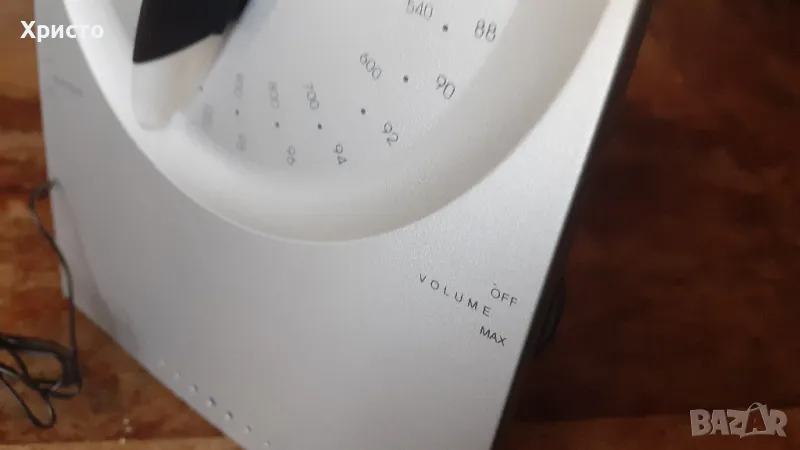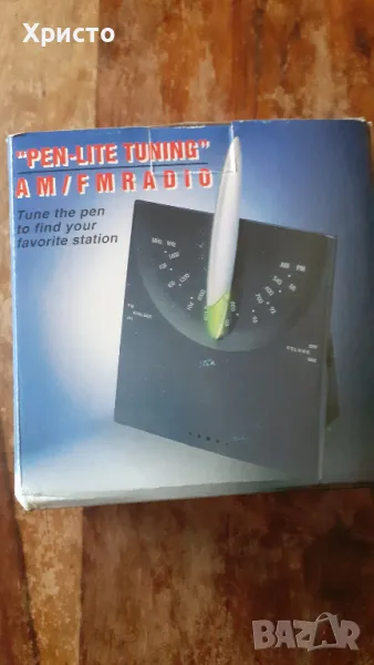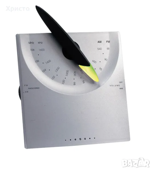 радио AM/FM със светеща ярко стрелка за настройване на станциите. Размер на радиото отпред 11х11 см, основа 11х6, смяна на FM и АМ вълни, бутон за силата на звука, включване и изключване, антена. Има жак DC-IN 4,5 V, работи с 3 броя батерии ААА, които не са включени в цената. Последни 5 бройки останаха. Цената е за 1 брой. Чисто ново радио внос от Италия, не е ползвано нито минута. Иновативен дизайн. Сребриста матова пластмаса.