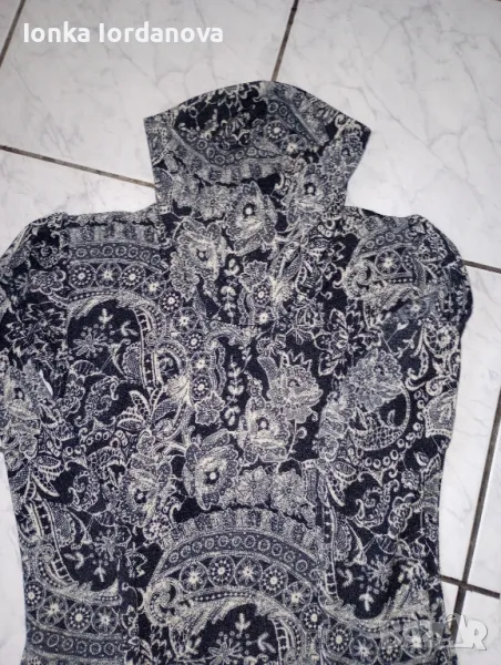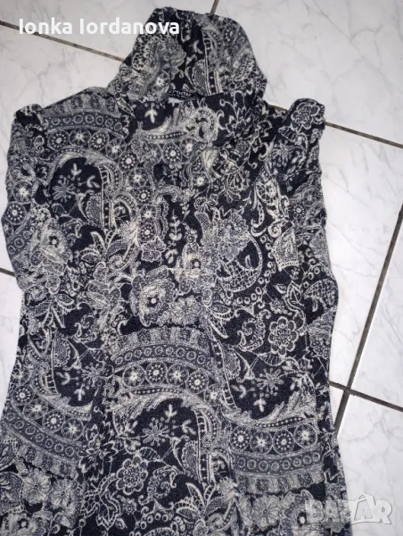 Елегантна рокля от мек, немачкаем, леко разтеглив плат. Роклята е с елегантна, вталена линия, черна с бели цветя. С дълъг ръкав, от рамото лек набор. Яката е тип поло, но не плътно прилепнала.