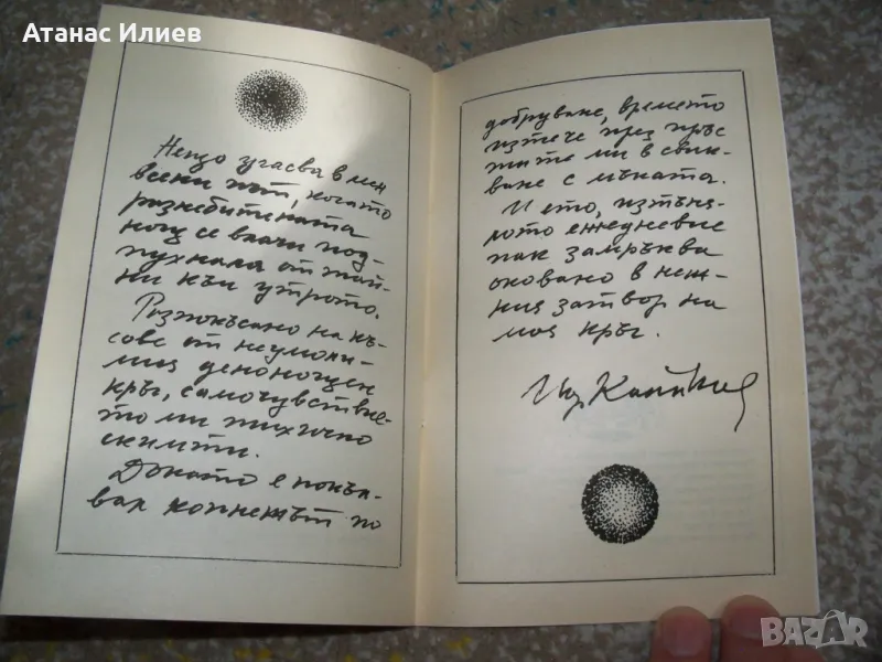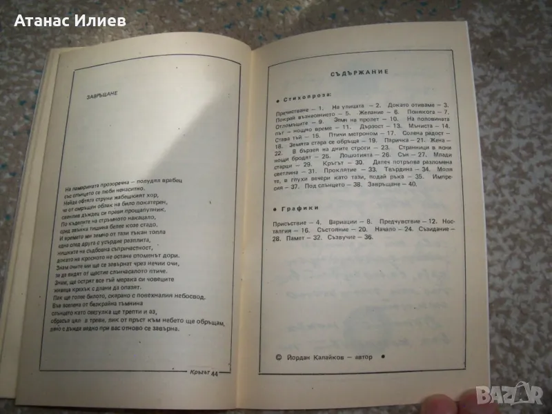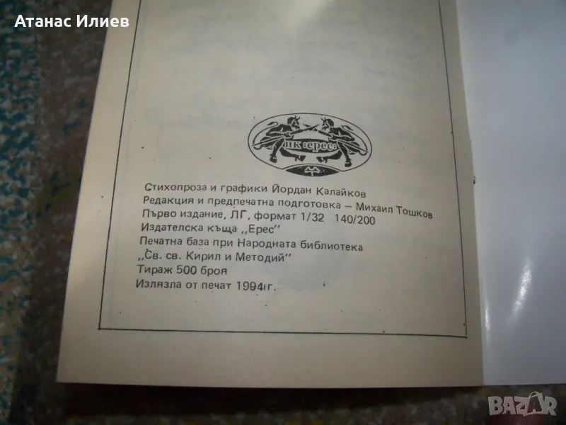 Много рядко издание "Кръгът - колажи от стихопроза и графики" автор Йордан Калайков. Книгата е библиофилска рядкост, издадена е през 1994г. от издателска къща "Ерес" в ограничен тираж. Книгата е с меки корици, 44 стр. с илюстрации от автора и е в отлично състояние. Гордост за всеки колекционер.
