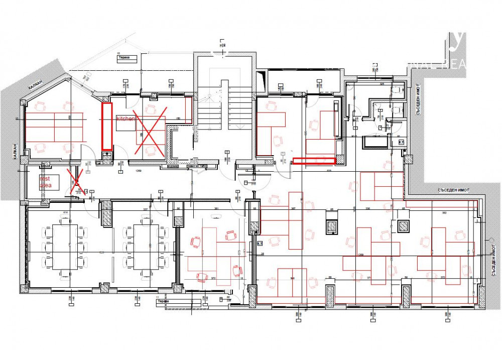 Разпределение:коридор, голямо 'open space' помещение, кухня, тоалетна, четири отделни работни помещения.