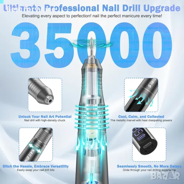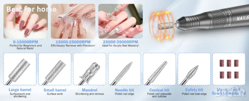 Професионален комплект бормашина за нокти: Безжичната бормашина за нокти включва машина за бормашина за акрилни нокти, изискан преливащ се дорник, 6 бр. метални битове, 6 бр. шлифовъчни ленти и USB кабел. Тези свредла за нокти се използват за шлайфане, шлайфане, рязане, заточване, полиране на акрилни и гел нокти, премахване на кожички, премахване на мъртва кожа и подрязване на дебели естествени нокти на краката
