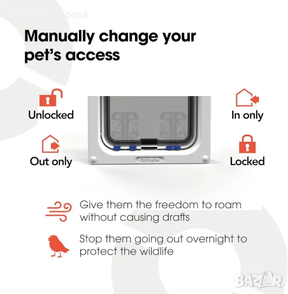 Сигурният четирипосочен заключващ механизъм дава възможност да пускате вашите котки да влизат и излизат, само вътре, само навън или заключени.
